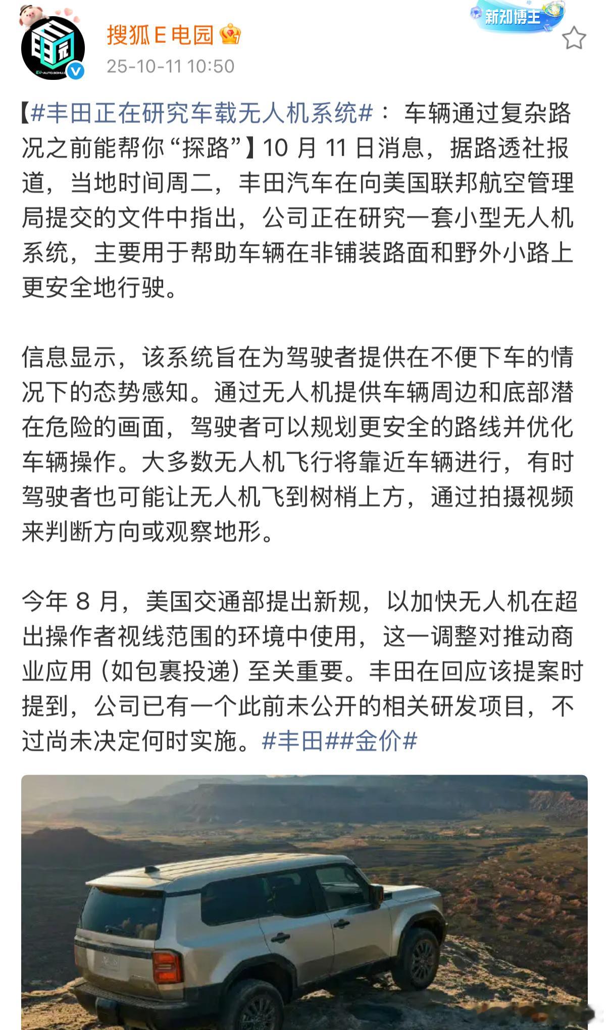 丰田正在研究车载无人机系统[doge]难道比亚迪灵鸢车载无人机系统真的领先一个版本?这东西未来不会真有搞头吧……