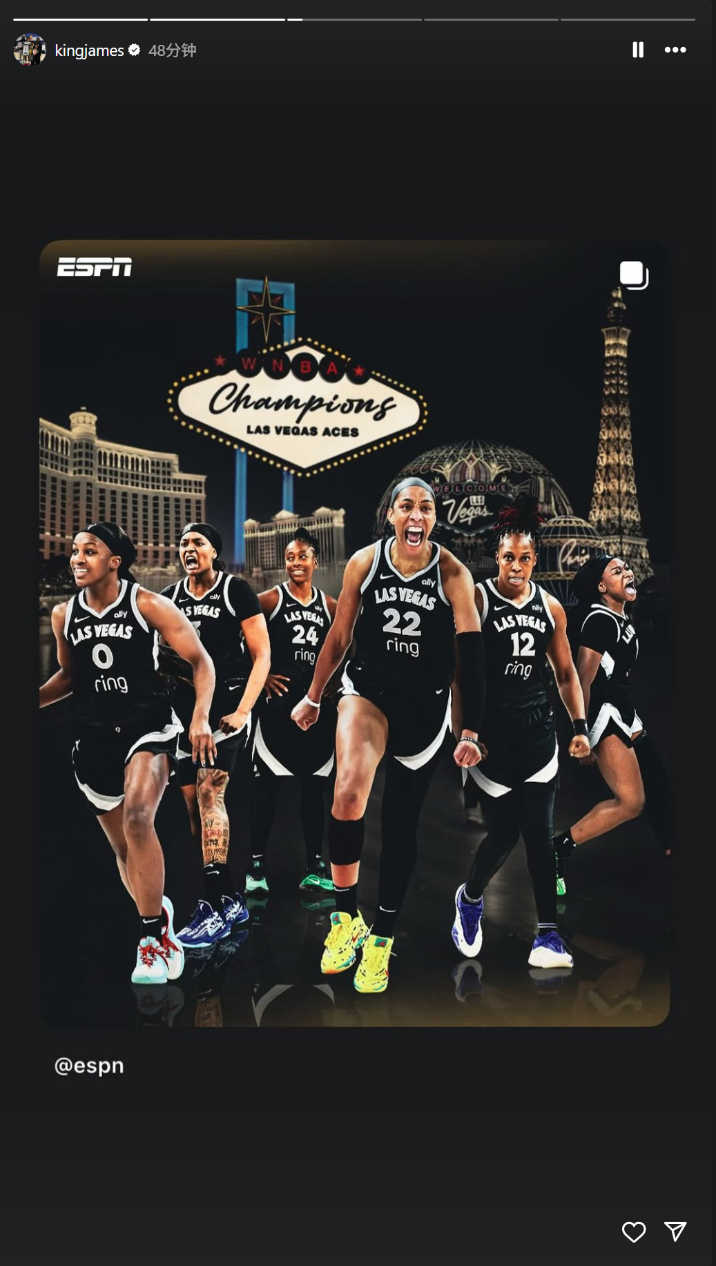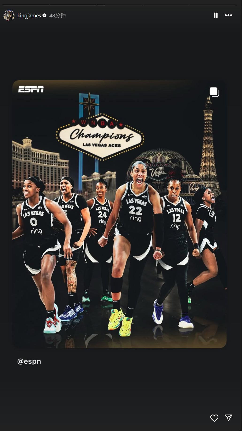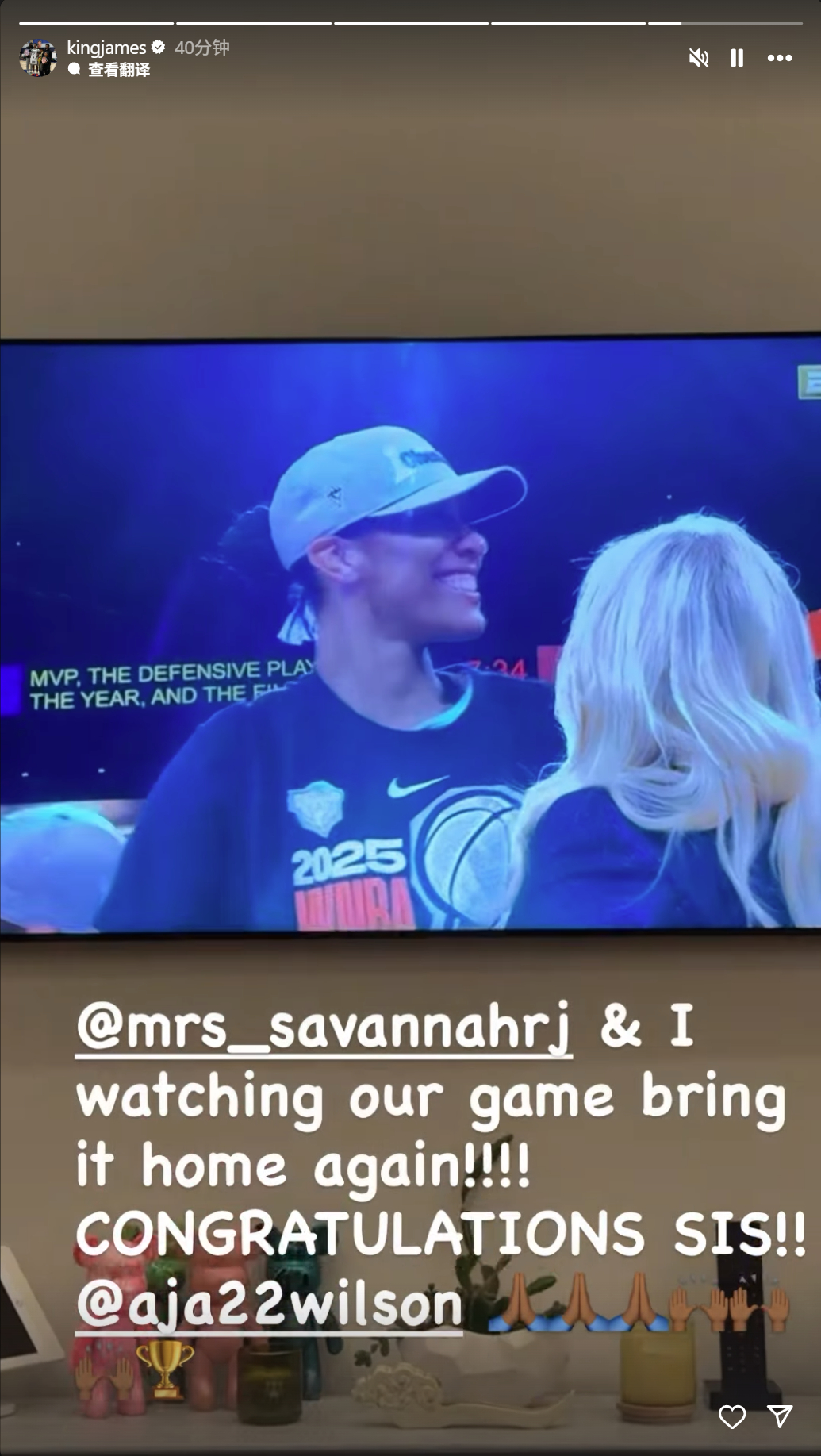 詹姆斯更新动态,今天在家里和妻子一起看WNBA总决赛,在王牌队夺冠后,为威尔逊送去祝贺!