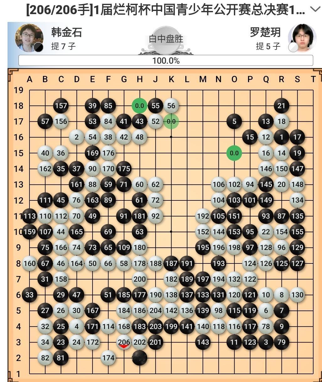 首届烂柯杯中国青少年围棋总决赛拉开序幕 唯一女棋手罗楚玥旗开得胜 2025首届烂柯杯中国青少年围棋公开赛32强总决赛于10月11日至14日在衢州市拉开大赛序幕。 本届烂柯杯青少年围棋公开赛于1月、4月、7月分别举行了三个分站的比赛,每站分别决出前8名共24名出线棋手,携手特邀8位棋手进入10月份的总决赛。 总决赛冠军奖金8万元。 年龄要求:职业男子2000年1月1日后出生,职业女子1998年1月1日后出生。业余棋手允许每站不超过8人参赛(选拔赛产生)。 第一分站有91人,第二分站126人,第三分站有119人报名参加比赛。 其中唐嘉雯、周泓余、吴依铭、李赫、陆敏全、方若曦、罗楚玥等女子一流棋手也曾报名参赛。 罗楚玥六段第三站比赛后,名次顺延至第8名幸运出线,成为全场唯一晋级总决赛的女子棋手。 首轮罗楚玥六段执白棋屠龙中盘战胜韩金石初段,取得开门红。 特邀8位棋手为:蒋其润、刘宇航、沈沛然、韩金石、张歆宇、陈一纯、许一笛、王硕03。 第一轮将对阵如下: 王春晖VS沈沛然 韩金石VS罗楚玥 蒋其润VS曾渊海 李昊潼VS黄明宇 傅健恒VS张歆宇 张紫良VS薛冠华 郑载想VS叶长欣 李欣宸VS刘宇航 李崇德VS陈一纯 吴俊毅VS陈瀚祺 林子杰VS王楚轩 成家业VS韩墨阳 肖泽彬VS邱禹然 马靖原VS段博尧 许一笛VS周子弈 陈豪鑫VS王 硕03