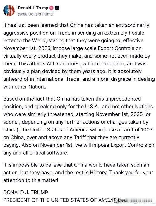 我们只是以其人之道还治其人之身,川普却装受害者…… 特朗普突然又威胁表态称将对中国商品大幅提高关税,理由是我们昨天出台的稀土出口管制措施对美国非常不利,不仅扩大了稀土品类范围,而且还涉及到了生产设备等一系列措施。说白了就是只要跟稀土沾边,出口就要审查。 川普宣布从 11 月 1 日起,将对中国产品征收100%的关税。 而且将于11月1日起,禁止对中国关键行业出口美国软件。 特朗普说手里还有很多牌,我们有软件,有波音飞机,有飞机零部件。 懂王的意思就是只管他放火,不许别人点灯。眼看扛不住了就又开始玩关税了。目前市场已被这个消息吓尿了,美股全体暴跌,三大股指集体跳水。