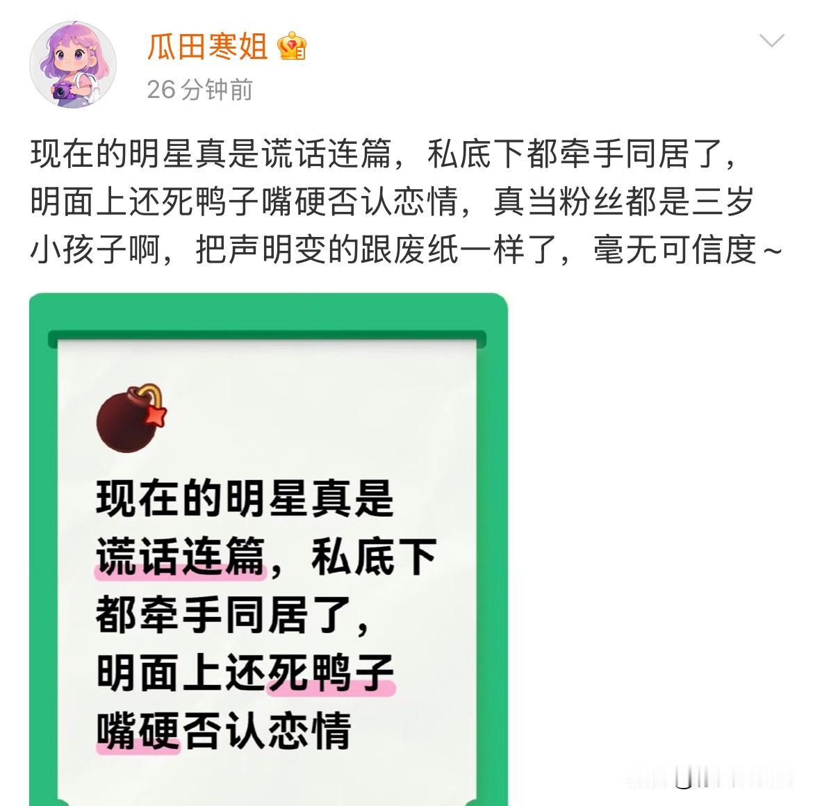 10月11日,又来一个瓜姐下场,讽刺孟子义李昀锐,私底下都牵手同居了还嘴硬! 别太在意孟子义李昀锐好么?人家男未婚女未嫁爱咋样咋样,谁规定谈恋爱一定要公开么?现在有点怀疑是不是有人故意为之坑他们俩了,第二个瓜姐的话是真难听! 这2小时过山车坐的,这瓜哥瓜姐大号没了,小号也该清理了,内娱不要狗仔能和谐很多! 无论孟子义李昀锐有没有在一起,都磕他俩,在一起就一起祝福,没在一起就分开祝福!