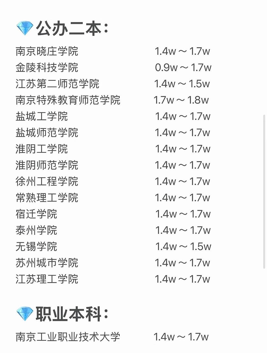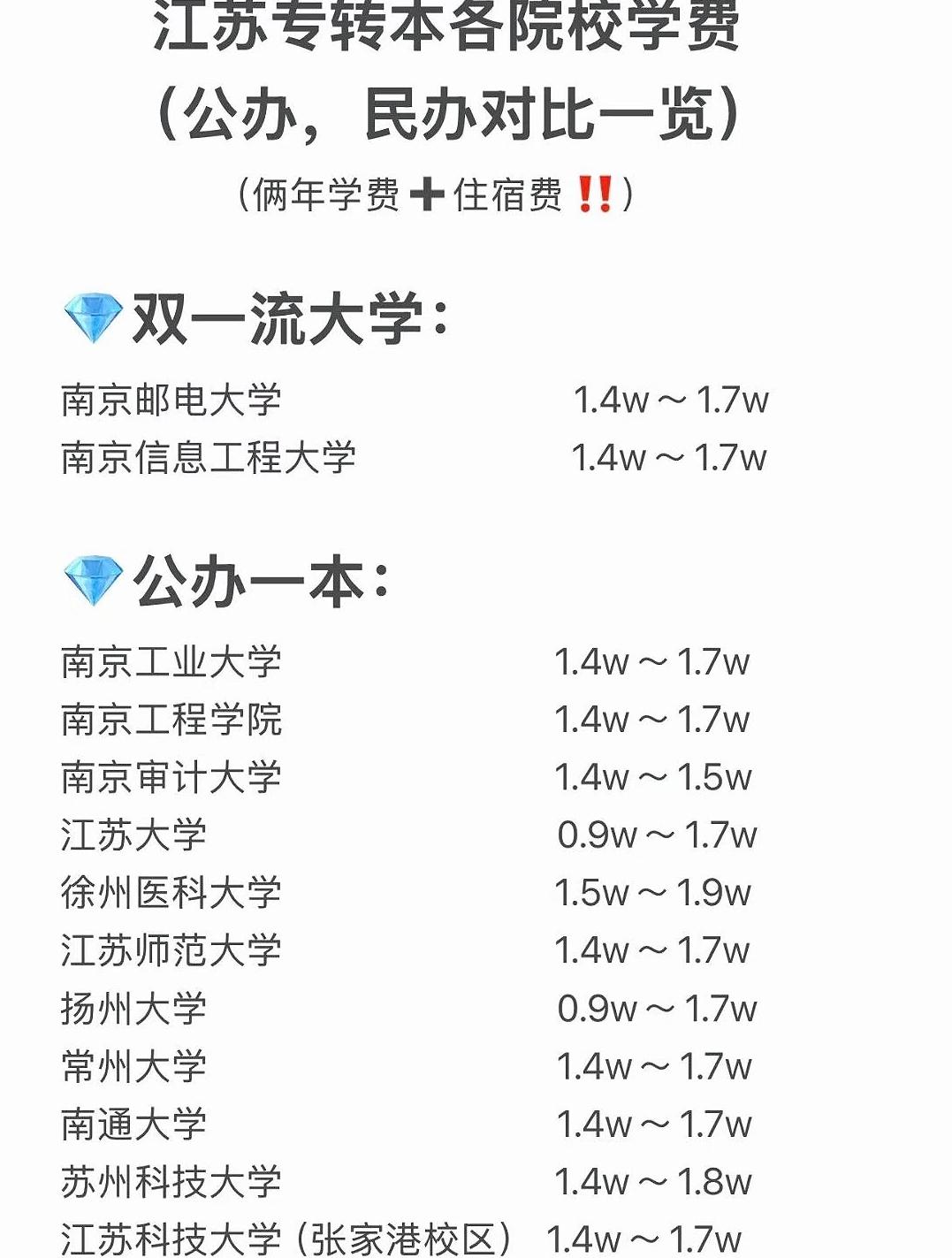 江苏专转本同学快看!公办、民办院校学费差距这么大,择校得精打细算 对于江苏准备专转本的同学和家长来说,择校时学费绝对是绕不开的关键因素。今天咱们就来好好聊聊江苏专转本各院校的学费情况,帮大家理理思路。 先看双一流大学,南京邮电大学、南京信息工程大学这两所,学费在1.4w~1.7w区间。能考上这两所双一流院校,不仅学校牌子硬,学费还很亲民,性价比直接拉满。 再看公办一本,像南京工业大学、南京工程学院等大多在1.4w~1.7w,南京审计大学稍低些1.4w~1.5w,江苏大学、扬州大学有部分专业0.9w~1.7w,徐州医科大学因为医学类专业特殊,在1.5w~1.9w。这些公办一本院校教学资源扎实,学费也在大多数家庭可承受范围内。 公办二本里的南京晓庄学院、金陵科技学院等,除了南京特殊教育师范学院在1.7w~1.8w,其余大多在1.4w上下浮动。像盐城工学院、淮阴师范学院这些,在当地口碑都不错,学费也很实在。 然后是民办本科,学费就明显高了不少。南京传媒学院3.2w~4.2w,三江学院3.8w~4.8w,无锡太湖学院、南通理工学院更是到了4.05w~5.05w。民办院校的学费对家庭经济条件是个不小的考验,但它们在专业特色、就业资源上也有自己的亮点,比如南京传媒学院的传媒类专业就很有优势。 还有职业本科的南京工业职业技术大学,学费1.4w~1.7w,和公办二本差不多,给了同学们更多元的选择。 选学校的时候,不能只盯着学费看。公办院校学费低,但竞争激烈,录取难度大;民办院校学费高,可录取机会相对多一些,专业选择也更灵活。而且不同专业的学费也可能有差异,大家得结合自己的成绩、专业喜好还有家庭经济情况综合考虑。 江苏的专转本政策也在不断调整,院校的学费和招生情况每年可能都会有变化。同学们和家长们得多关注最新的政策动态,多向学长学姐或者老师请教。 准备专转本的你,在择校时会更看重学费还是学校的综合实力呢?江苏退伍专升本 江苏转专本 江苏苏州专转本 江苏音乐专转本 江苏专本连读 江苏泰达专转本 江苏专接本