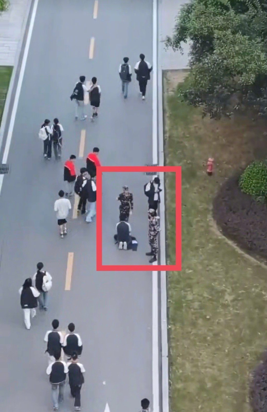 据介绍,身穿迷彩服的是学校纠察队的队员。他们在学校例行检查,考虑到大功率充电宝存在的潜在隐患,学校规定学生不能带充电宝进教室。一名同学违规携带充电宝被发现后情绪激动,想要通过下跪的方式博取同情,以此逃避处罚。