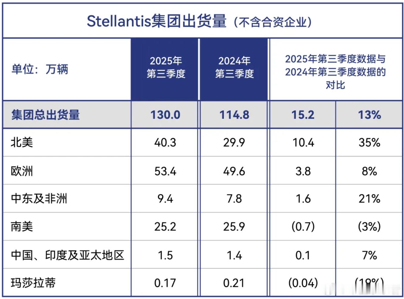 此外,在中东、非洲等其他区域,Stellantis整体出货量也实现了小幅增长。其中,中东和非洲区表现亮眼,同比增长21%,而南美区则略有下滑。stellantis集团汽场全开