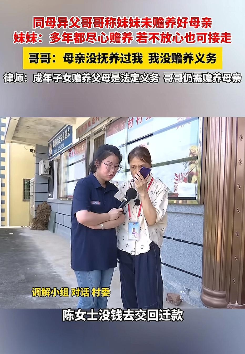 福建,儿子前去探望残疾母亲,见母亲居住条件简陋,饮食清淡,便觉得同父异母的妹妹没把母亲照顾好。母亲有智力障碍,妹妹一星期才给母亲送一次饭,致使母亲营养不良。 儿子找来调解员,打算和妹妹协商将母亲送去养老院。 调解员问:“你为何不把母亲接回家照顾呢?” 儿子回应:“我从小父母就离异了,母亲从未照顾过我,我也没有赡养义务。” 这种说法有误,从法律层面讲,只要父母生育了你,你就有赡养的责任。 调解员又问儿子:“你母亲只有残疾人低保,这点钱可不够住养老院。” 儿子答道:“前段时间母亲住的老房子拆迁,有几十万赔偿款,都在妹妹手上,这些钱足够支付养老院费用了。” 妹妹来到调解现场,否认自己没照顾好母亲,更不承认有几十万拆迁款。 调解员向村委会和母亲的邻居了解妹妹照顾母亲的情况。 村委会的人表示:照顾得很好。 邻居称:她女儿做得很不错,常给母亲买好吃的。 负责拆迁的人答复:确实有拆迁,但没有拆迁款,只有一套房子,因回迁款还未交,所以房子还没拿到手。 调解员问母亲:“你女儿对你好不好?” 母亲连声说:“好、好、好。” 妹妹听到村委会和邻居的回答,压抑已久的委屈瞬间爆发,号啕大哭道:“我父亲去世十几年了,一直是我在照顾母亲,我亲哥哥还有精神病,也得我照顾,我太难了。” 等妹妹情绪平复后,她对调解员说:“我不同意送母亲去养老院,母亲我自己养,不用他付赡养费。” 儿子站在一旁抱臂说道:“那就走法律程序吧。” 有网友质疑儿子的行为,怀疑他可能觊觎母亲的拆迁款。 或许儿子想送母亲去养老院是出于好意,可妹妹愿意独自赡养母亲,希望儿子就不要插手。有时间多来看看母亲就好。 妹妹照顾母亲的过程中,若需要帮助,也希望儿子能伸出援手。 来源:第一帮帮团