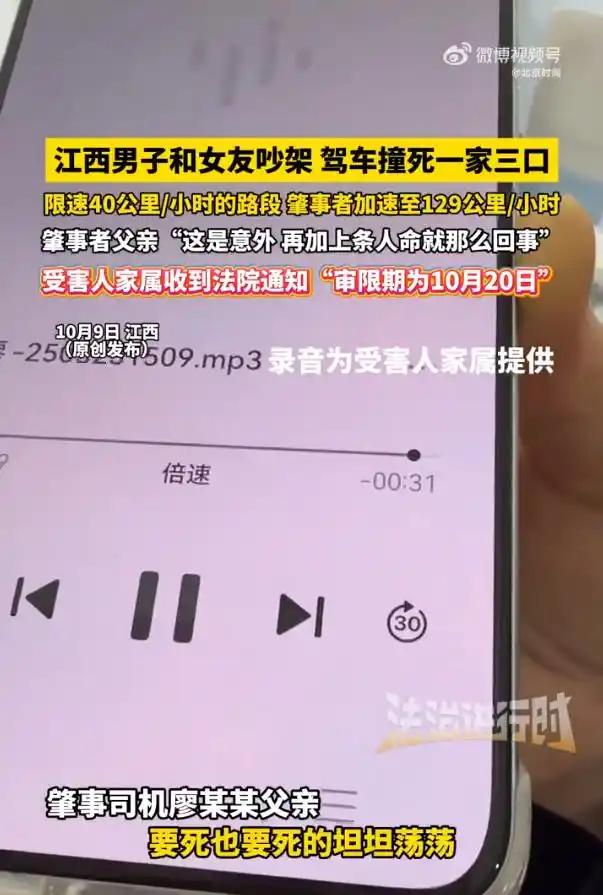 距离2025年10月20日的判决越来越近,这起发生在景德镇的惨烈车祸,注定会成为司法对“情绪驾驶”判决的重要标杆。 一家三口瞬间殒命,只留下两个破碎的家庭,这件事牵动了太多人的心。 网上最让人揪心的,是那位失去儿子一家三口的母亲。她整个人像被抽空了灵魂,一遍遍举着牌子重复那天的经过——儿媳和孙子当场就走了,儿子送医也没救回来。儿媳被撞飞后重摔在地,儿子被撞到五十米开外,刚满周岁的孙子更是惨不忍睹,挂在肇事车的挡风玻璃上…… 而那个叫廖某的司机,下车后居然淡定地点了根烟,不但没报警、没救人,还在跟朋友谈笑。最后还是看不下去的路人帮忙叫的120。 这场悲剧,原本完全可以避免。 事发前,廖某刚和女友吵完架,甚至放话“不是你死,就是我亡”。绿灯一亮,他两次把油门踩到100%,女友怎么劝都没用。直到撞上前0.4秒,他才急转了15度,但一切为时已晚。司法鉴定显示,他没喝酒也没吸D,车也没问题——说白了,这场悲剧完全是他故意造成的。 就因为情绪失控,他在限速40公里的路上开到了128公里。这根本不是普通的交通事故,这根本是揣着一肚子火上街索命。 更让人心寒的是他事后的态度。还有心思抽烟说笑,听说“超速撞死三人最多判七年”,更是有恃无恐。 他父母也是一个样,不但想用80万私了,还对着受害者家属叫嚣:“我儿子撞人是天灾,你们揪着不放就是人祸。”甚至打电话威胁老人:“不私了,就把赔你们的钱拿去买你们的命。” 可他们口中的“小事”,却是两个家庭的天塌。遇难的一家三口都是独生子女。从那以后,两边的老人全都患上了重度抑郁,整夜睡不着,靠药物才能眯一两个小时。 女方的爷爷直到今年三月才知道孙女不在了,伤心过度也走了;奶奶身体也彻底垮了。男方的妈妈强撑着最后一口气,就为了讨个公道,连眼泪都流干了。 因为廖某是故意超速,保险公司拒赔。三个受害人的丧葬费,全是老人们自己凑的。没人给他们做心理疏导,他们就这样人财两空,活得像个空壳。 这事闹大之后,绝大多数人都认为不能只按交通肇事处理。如果跟女朋友吵个架就能上街飙车泄愤,那谁还敢出门? 廖某的行为威胁的是所有路人的安全,按“危害公共安全罪”判,完全说得过去。交通肇事罪是过失犯罪,最高七年;危害公共安全罪是故意放任危险发生,最高能判死刑。 一个不把别人生命当回事的人,凭什么要求别人尊重他的生命?严惩凶手,既是对逝者的交代,也是对生者的慰藉。