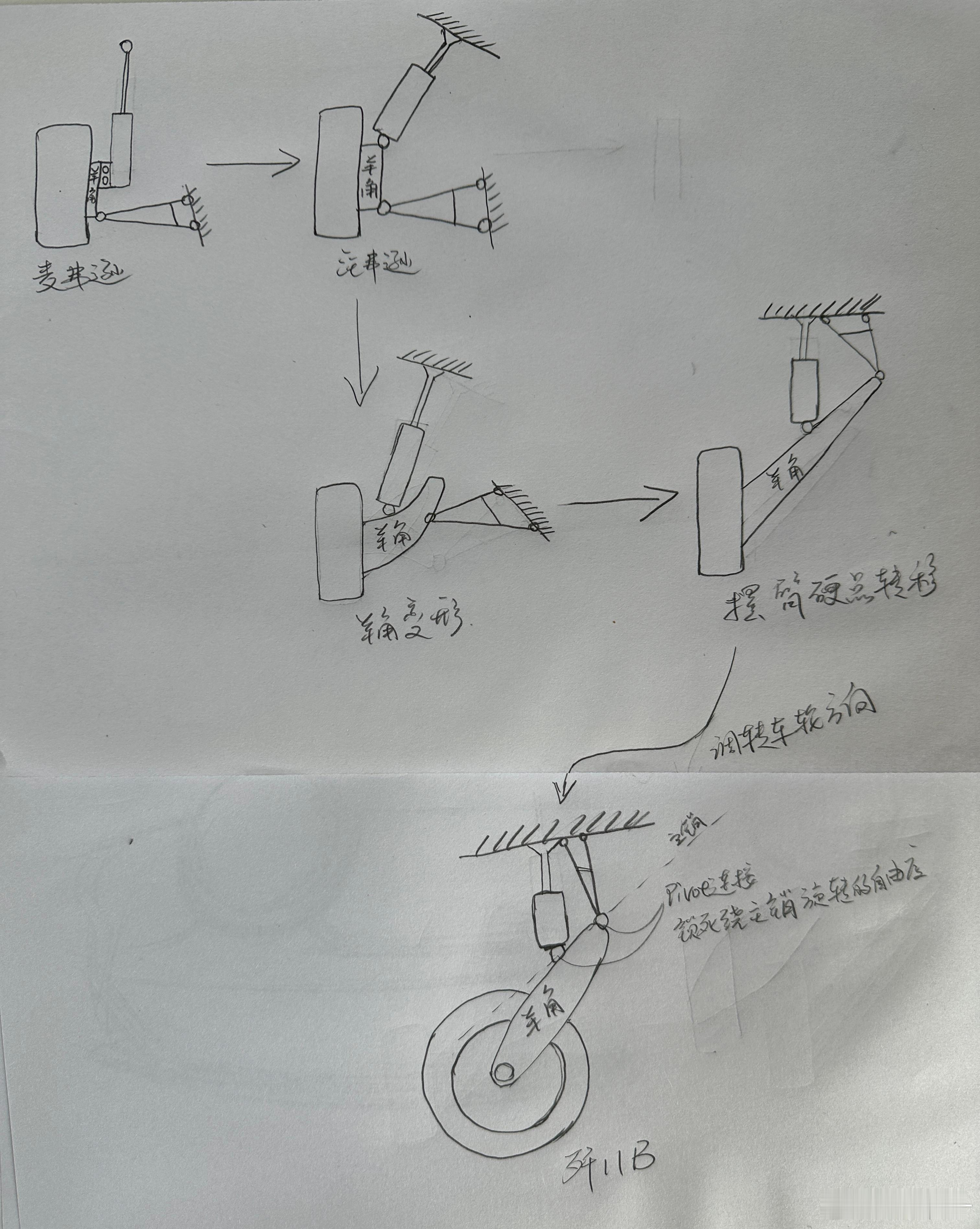 将汪弗逊一步步变形(图3),就成为了歼11B战斗机的前悬架。歼11B将摆臂与羊角、滑柱与羊角改用枢轴连接,锁死了羊角绕主销旋转的自由度,然后在上方单开一个转向节,用液压缸推动转向(图5),可称为“dual axis 汪弗逊”悬架。