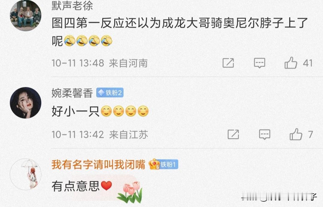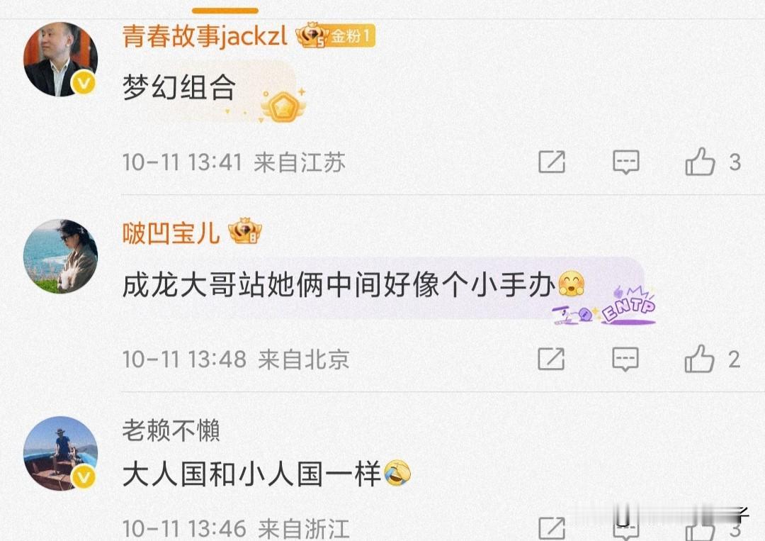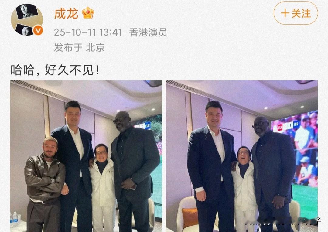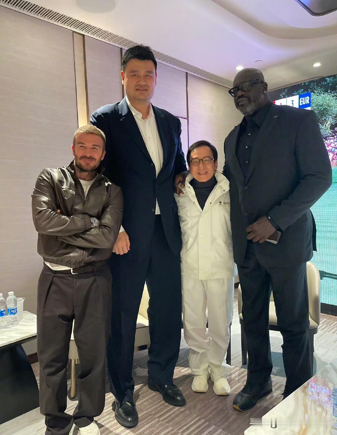 成龙和姚明、奥尼尔合影,评论区笑不活了![大笑] 10月11日,成龙大哥在社交平台晒出一组合照,并配文:“哈哈,好久不见”! 一看照片,我滴乖乖,左边是姚明,右边是奥尼尔,都是知名篮球运动员,结合配文,看的出来,成龙和两人应该比较熟悉。 再看评论区,网友们的留言:梦幻组合,成龙大哥站在两人中间,好像小手办,真的好可爱呀!手里拿着小熊,就跟骑在奥尼尔脖子上一样。 到网上科普一下,奥尼尔身高2米16,姚明身高2米26,成龙身高173cm! 按理说,成龙大哥并不算矮,只能说,两位篮球运动员太高了。 此外,合照中另一位成员贝克汉姆,站在姚明和奥尼尔身边,显得好小一只。 说实话,无论哪个明星和两人合影,身高上估计都有点压力。 有一说一,成龙大哥状态保持的真好,见到老朋友格外开心。