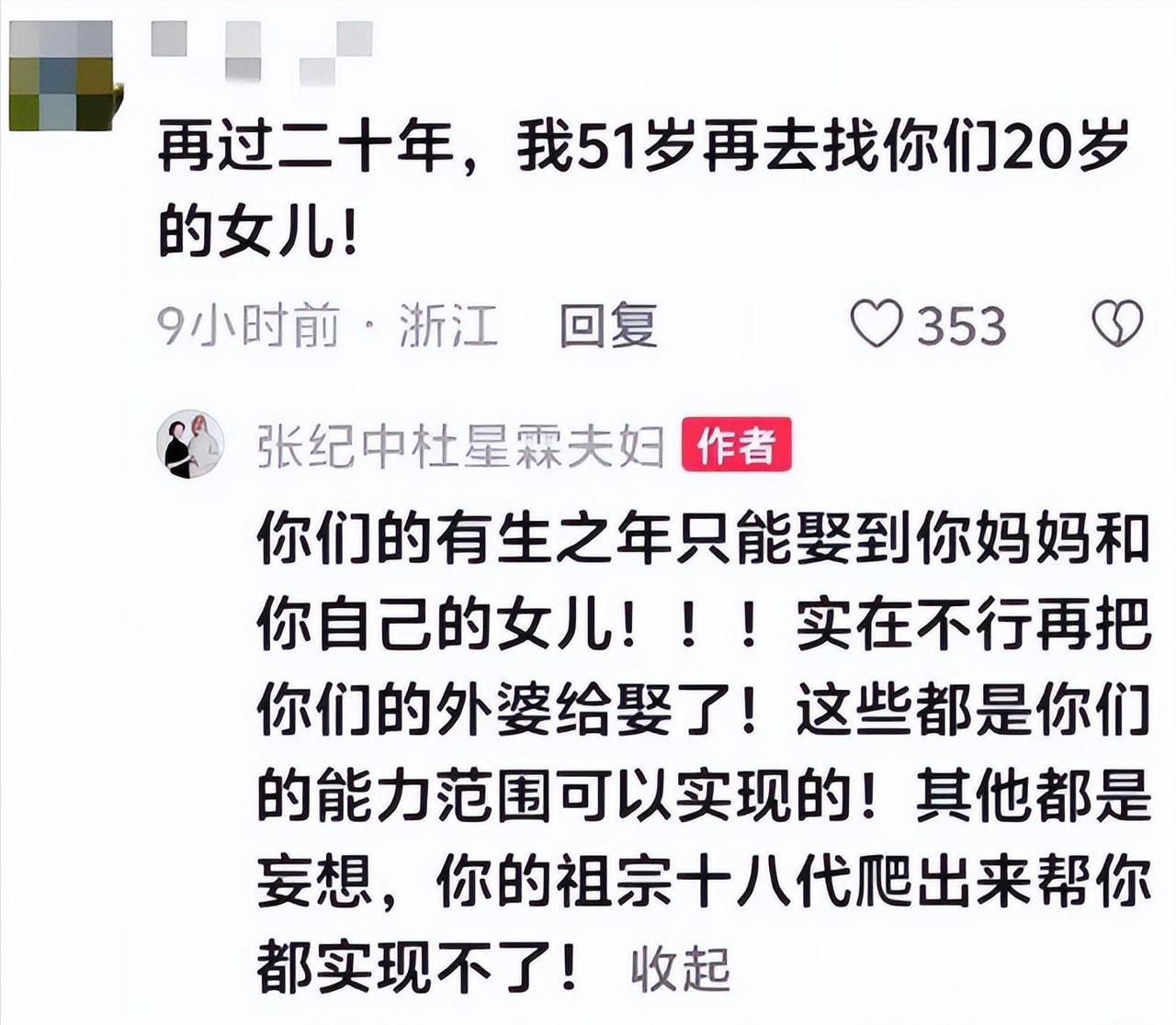 钱再多有什么用?74岁张纪中的女儿才1岁, 让人厌恶的事情发生了 “70岁生娃,是父爱还是自私?”——这话听着扎心,但张纪中最近就撞上了这波舆论风暴。 国庆期间,他给小女儿小龙珠办一岁生日会,发了段温馨视频: 74岁的他抱着穿粉色裙子的娃,笑得眼睛都眯成缝, 妻子杜星霖在旁边张罗蛋糕、吹气球,画面本该暖到爆。 可评论区画风突变:“等孩子20岁,你都94了,她管你叫爸还是叫太爷爷?” 更难听的留言直接拿年龄开涮,句句带刺。 杜星霖忍不住回怼:“我家的事,轮不到你审判!” 结果越解释越乱,攻击反而升级——有人说她“图钱上位”,有人说张纪中“老牛吃嫩草”,连无辜的孩子都被卷进口水战。 最后,视频不是删了,就是设成“仅好友可见”。 这事为啥总被翻旧账?得从8年前说起。 张纪中刚和前妻撕破脸离婚,转头就和小30多岁的经纪人杜星霖闪婚。 尽管他强调“离婚后才在一起”,但“无缝衔接”太惹眼,外界直接贴标签:一个贪年轻,一个图资源。 八年过去,这口锅他们还没甩掉。 后来杜星霖连生三娃,本想用行动证明真心,网友却更来劲:“70岁生娃,是爱还是自我感动?” 今年夏天一家去山西旅游,照片里张纪中爬台阶喘得厉害,走路要人扶, 孩子们在前面跑,他只能远远看着——评论区又炸:“这不是亲子游,是保姆带娃+照顾老人。” 他嘴上说自己是“高能量少年”,可岁月不饶人。 春节全家飞国外团聚,照片里他明显憔悴,杜星霖一手抱1岁娃、一手拖行李,四个孩子全靠她扛。 这哪是甜蜜团圆?分明是她在硬撑一个家。 现在他天天晒“全职奶爸”日常:喂奶、做饭、换尿布,系着围裙炒菜的样子很认真。 可网友冷笑:“作秀罢了。”越是用力证明“我们很幸福”,越显得心虚。 说到底,张纪中不缺钱。《西游记》《射雕》的版权躺着都赚钱,孩子能上顶级私校、穿名牌、住豪宅。 可他买不来时间,买不来健康,更买不来一句“祝福”。 金钱能堆出精致生活,却挡不住一句“你配吗?” 孩子们现在不懂,等长大看到网上那些话,会不会问:“爸爸,你生我,是为了爱,还是为了证明自己还能行?” 杜星霖说不在乎外界眼光,可她眼里的疲惫藏不住——一边是年幼的孩子,一边是衰老的丈夫,还有永不停歇的键盘审判。 有些东西,真的不是有钱就能搞定。 你怎么看?70岁当爸,是勇气还是任性? 评论区聊聊,别让偏见,淹没了复杂的人性。