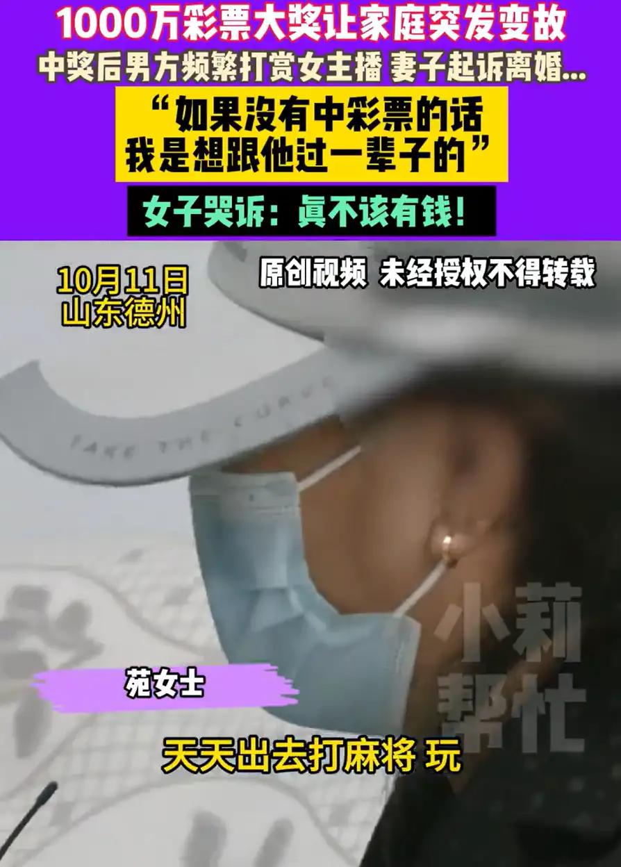 山东德州,一男子买彩票中了1000万大奖,本来一家人高兴地不行,以为好日子来了,没想到,男子却沉迷女主播,频频给对方打赏,妻子实在是忍无可忍,起诉离婚,并且哭着说:如果没彩票的话,我是想跟他过一辈子的! 李女士(化名)的丈夫王先生(化名)是个普通的上班族,平时最大的爱好就是下班后买两注彩票,夫妻俩结婚十年,日子不算富裕,但互相体谅,小日子过得有滋有味。今年,王先生随手买了张彩票,开奖时却发现自己中了1000万大奖,扣完税到手也有800万。 拿到奖金的那天,王先生搂着李女士说:“以后再也不用让你跟孩子受苦了,咱们换个大房子,再给你买个金镯子。”李女士当时满心欢喜,以为苦日子终于熬到头了。 从那以后,王先生像变了个人。他辞掉了工作,每天在家抱着手机刷直播,很快迷上了一个年轻的女主播。一开始只是偶尔刷个几十块的礼物,后来越陷越深,女主播一句“哥哥真大方”,他就能随手打赏几千块。李女士劝过几次,可王先生总说“我自己中的钱,想怎么花就怎么花”,后来甚至把银行卡密码改了,对家里的事不管不顾。 有一次,孩子发烧要去医院,李女士让王先生拿点钱,他却头也不抬地说“忙着呢”,手机屏幕上还停留在给女主播打赏的界面。那一刻,李女士彻底寒了心。她偷偷查了银行卡流水,发现短短几个月,王先生已经给女主播打赏了近300万,当初承诺的大房子、金镯子,连影子都没见着。 绝望之下,李女士提出了离婚。“我跟他过了十年,穷的时候都没怨过他,没想到有钱了,他倒把家给扔了。”