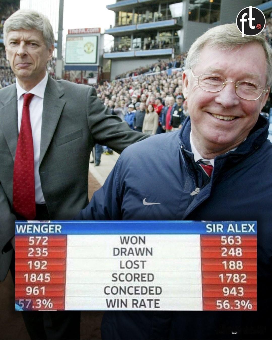 如今的年轻球迷恐怕很难理解,这场传奇对决对英超历史有着何等重要的意义。 🇫🇷 阿尔塞纳·温格: ▪️ 胜场:572 ▪️ 平局:235 ▪️ 负场:191 ▪️ 进球:1845 ▪️ 失球:961 ▪️ 胜率:57.3% 🏆 17座奖杯 🏴 亚历克斯·弗格森爵士: ▪️ 胜场:563 ▪️ 平局:248 ▪️ 负场:188 ▪️ 进球:1782 ▪️ 失球:943 ▪️ 胜率:56.3% 🏆 38座奖杯 在1992/93赛季至2003/04赛季的12年间,两人联手包揽了11次英超冠军,并斩获7次足总杯冠军。