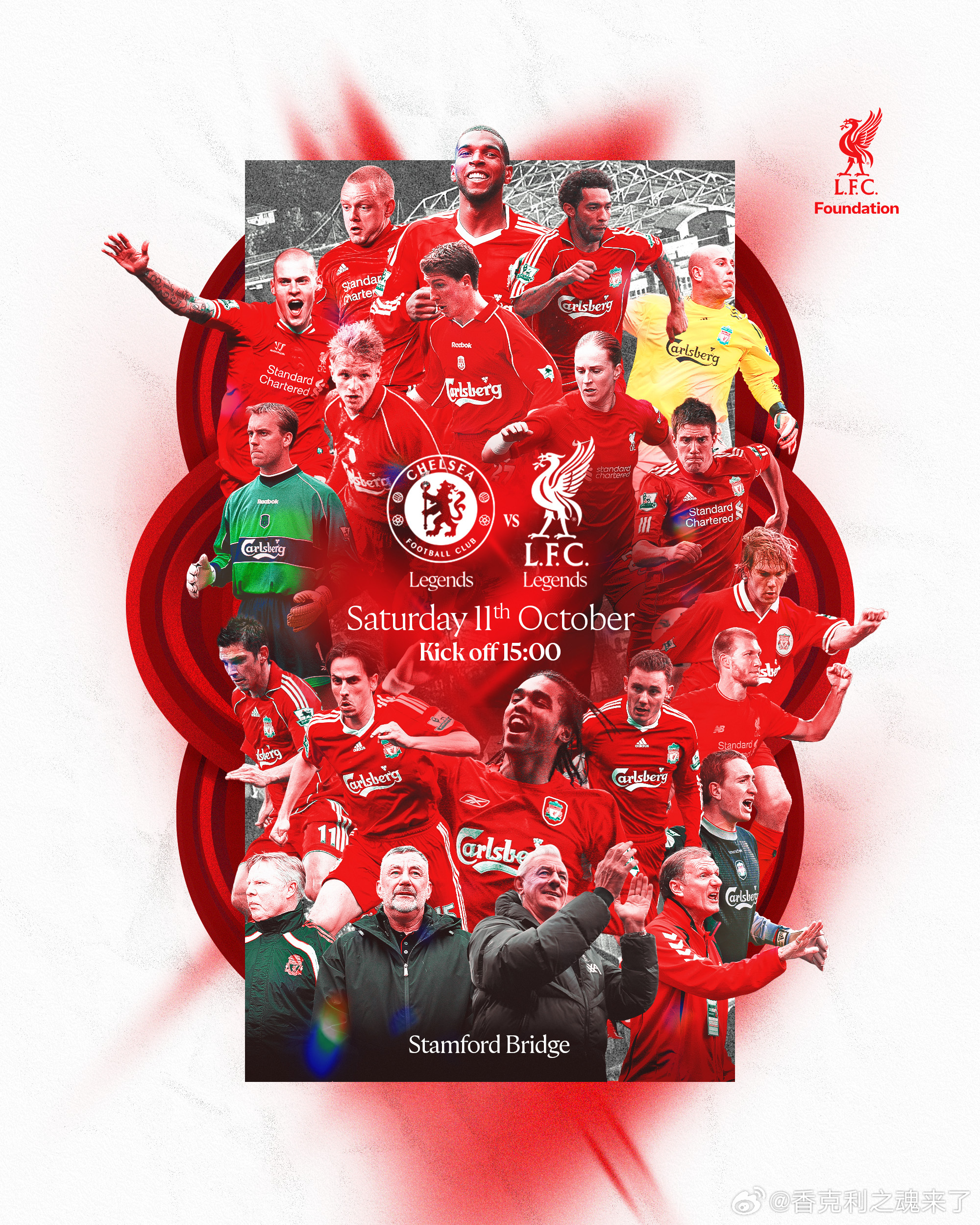切尔西传奇队将在主场迎战利物浦传奇队,利物浦官推晒出海报写道:“利物浦传奇队迎来比赛日!