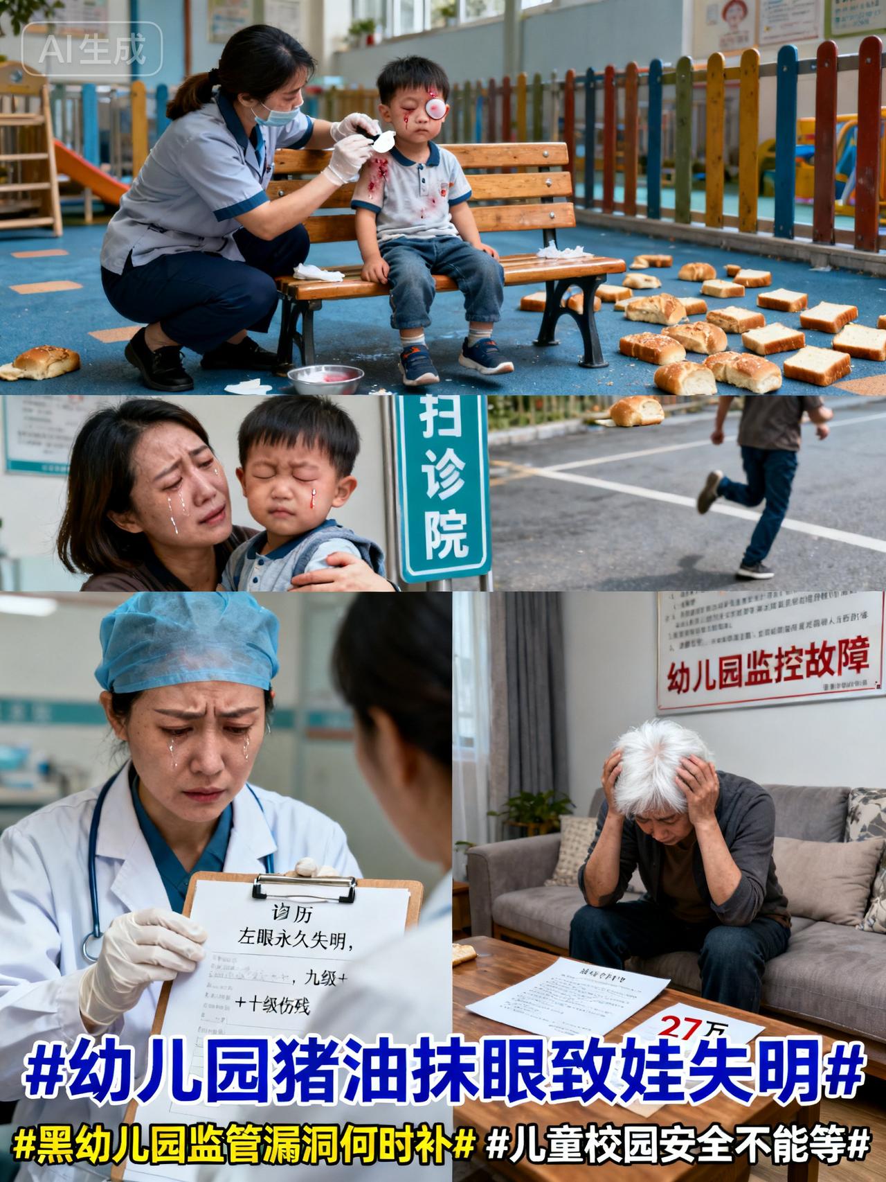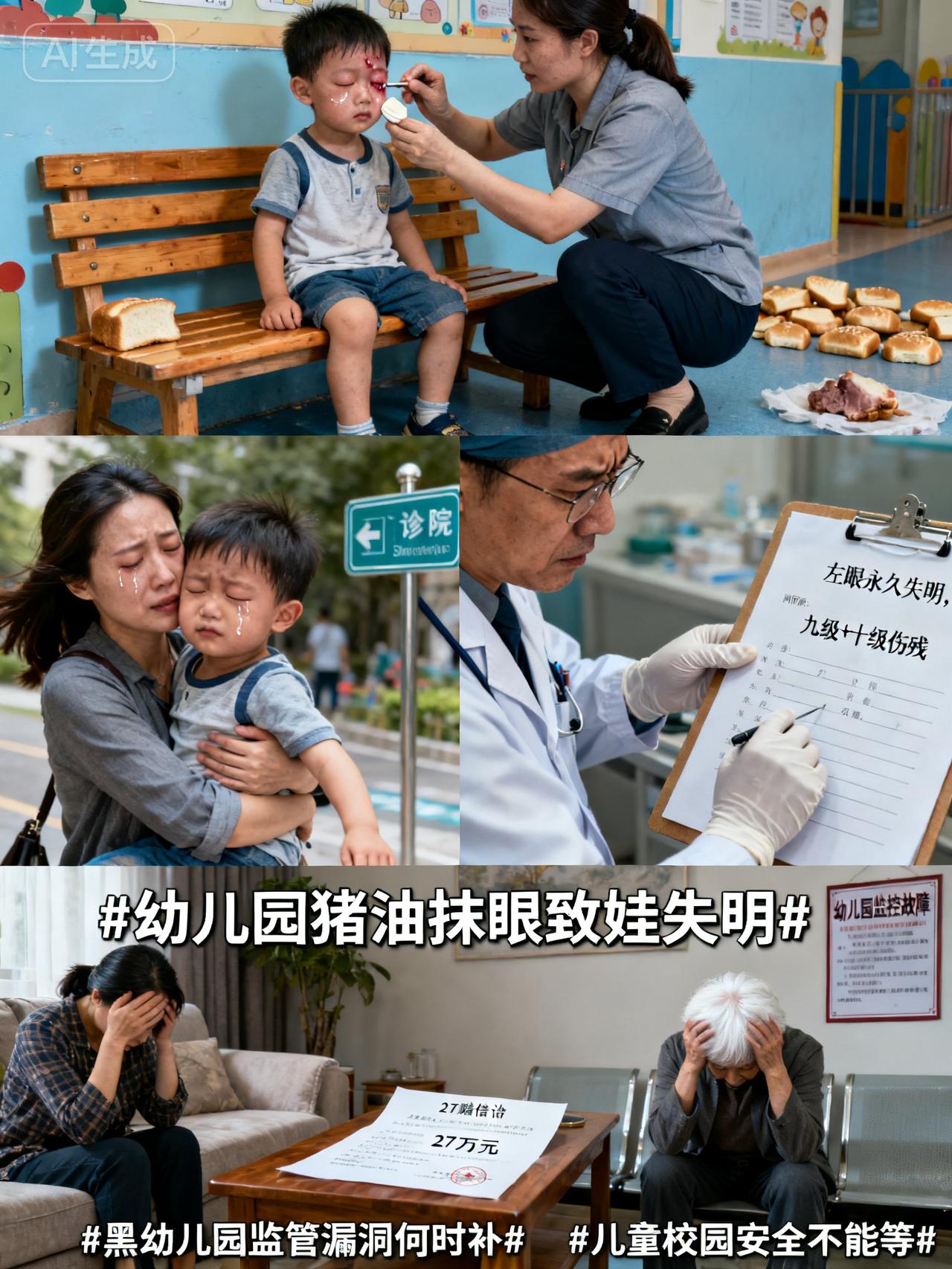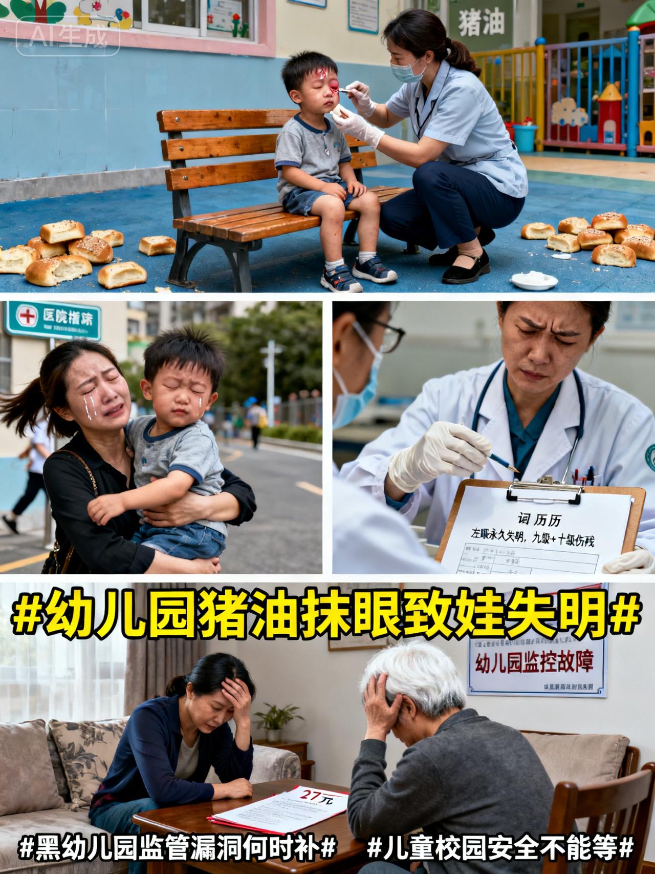 猪油抹瞎5岁娃!幼儿园这蠢招,凭啥让孩子用一辈子光明换? 今早刷到江西瑞昌这事儿,我手里的杯子都差点没拿稳,眼泪唰就下来了——你说多揪心啊!5岁的小男孩在幼儿园,被同学用铅笔戳中左眼,听说眼球里的角膜、虹膜全破了,房水顺着眼缝往外流,我光想想都觉得疼得慌! 结果在场的老师,居然既不送医也不喊家长,转头从厨房找了块猪油,往孩子伤口上抹,还说“老辈人都这么弄,能消肿”!就这荒唐的“土法子”,硬生生拖了两个多小时。 直到放学,孩子妈妈老远就看见儿子左眼肿得像颗烂桃子,眼皮都睁不开,一问才知道出了事,当场就哭了,抱着娃疯了似的往医院跑。可医生一检查就叹气:猪油把伤口堵死了,细菌全在里面长,左眼彻底感染,就算动了手术,也只能永久失明,最后鉴定是九级加十级伤残,好好的孩子,就这么成了独眼龙。 后来才知道,这幼儿园压根没办学资质,老师的急救培训就是挂着网课刷2小时,连实操都没有;平时给孩子吃的小面包,我看评论里有人说,都过期好几天了。出事后要调监控,园方支支吾吾说“坏了”,最后只肯赔27万——可后续还有几十万的治疗费要花,这钱连零头都不够,孩子爸妈现在天天愁得头发都白了,晚上根本睡不着觉。 我特意给做眼科医生的发小打了电话,他说眼外伤有“四不原则”,不涂药、不冲洗,找块干净纱布盖上立刻送医,这都是最基础的常识!现在教育局还在那儿说“处理中”,可孩子的眼睛,再也回不到从前了啊! 这哪是意外?分明是幼儿园瞎搞、监管部门不管,把孩子推进了火坑!你们说,咋才能拦住这些害人的“黑幼儿园”?这家人的公道,到底该找谁要啊? 幼儿园猪油抹眼致娃失明 黑幼儿园监管漏洞何时补 儿童校园安全不能等儿童抹脸油 幼儿园猪油摸眼致失明