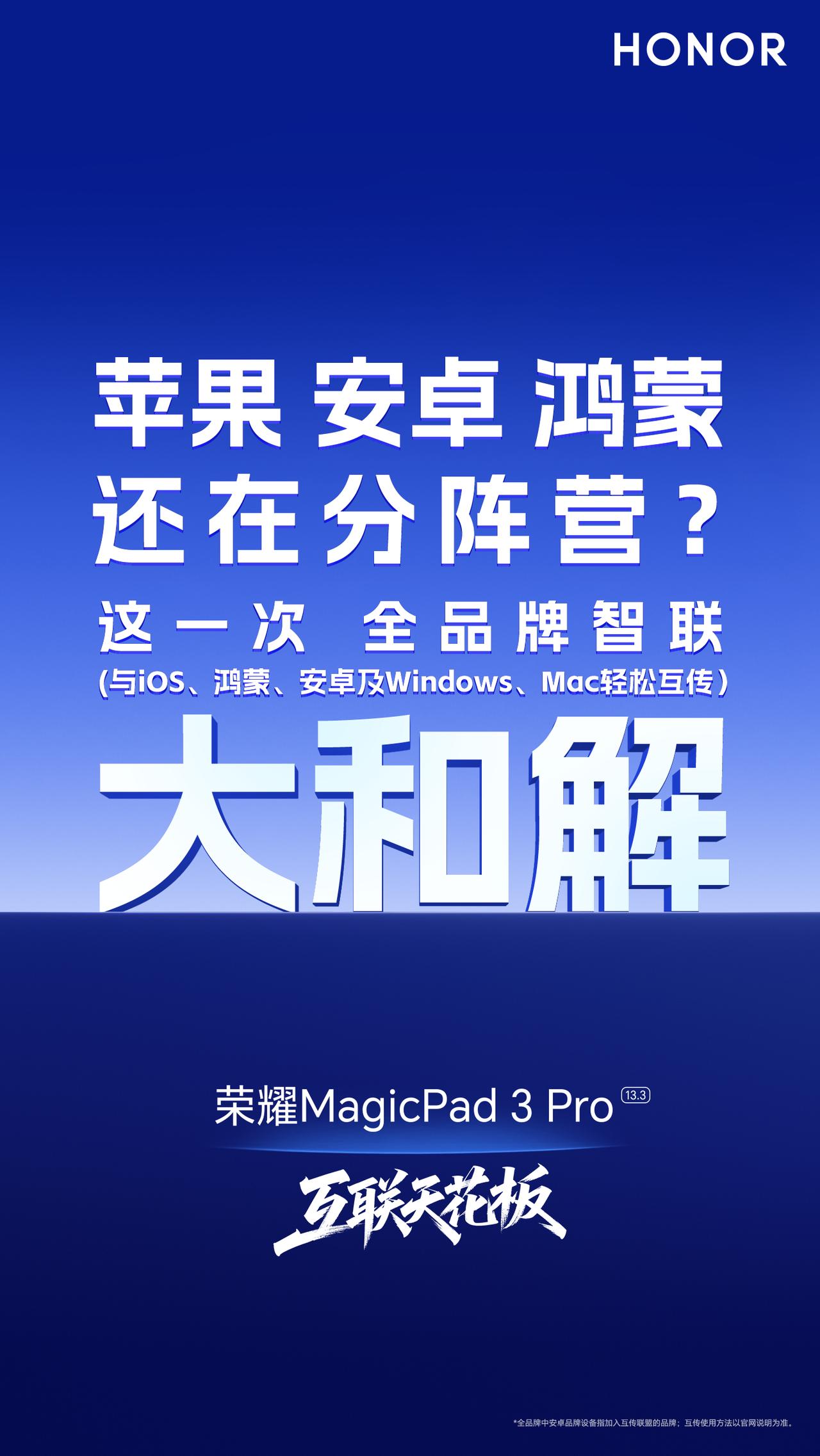 荣耀这次的新平板荣耀MagicPad3Pro ,看着也是有点残暴。跑分干到了430万,还是室温跑出来的。这波有一点很违背祖训的地方,就是也给上了最新的第五代骁龙8至尊。以往新的旗舰芯片上来,手机会先上,同期的平板会用上一代的旗舰芯。这波直接是对齐了,非常违背组训,要把性能给拉到最满。所以说荣耀变了。 另外这波值得关注的还有互联这块,全品牌互联。什么iOS鸿蒙安卓winMac,全都要。在之前手机上面释放出来的信号是互传各家都可以打通,好评率很高。这会平板也会更进一步,大大小小全通。秦始皇附体