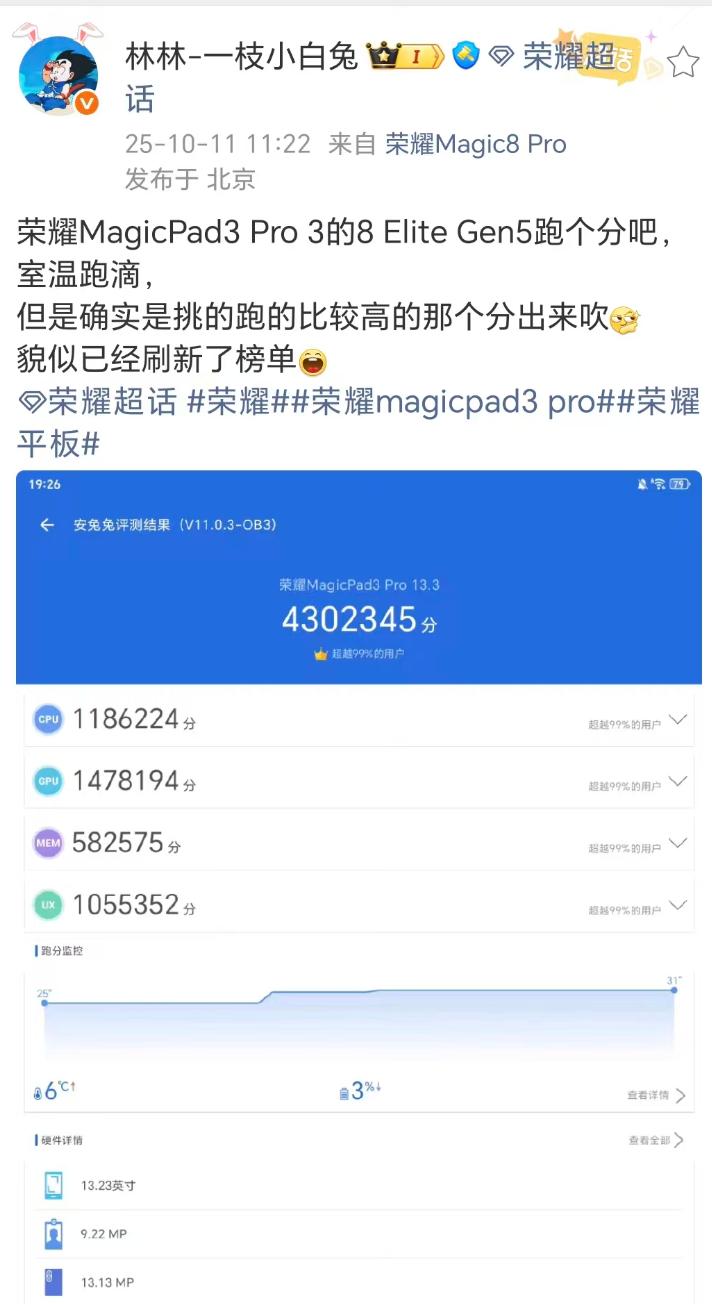 荣耀这次的新平板荣耀MagicPad3Pro,看着也是有点残暴。跑分干到了43