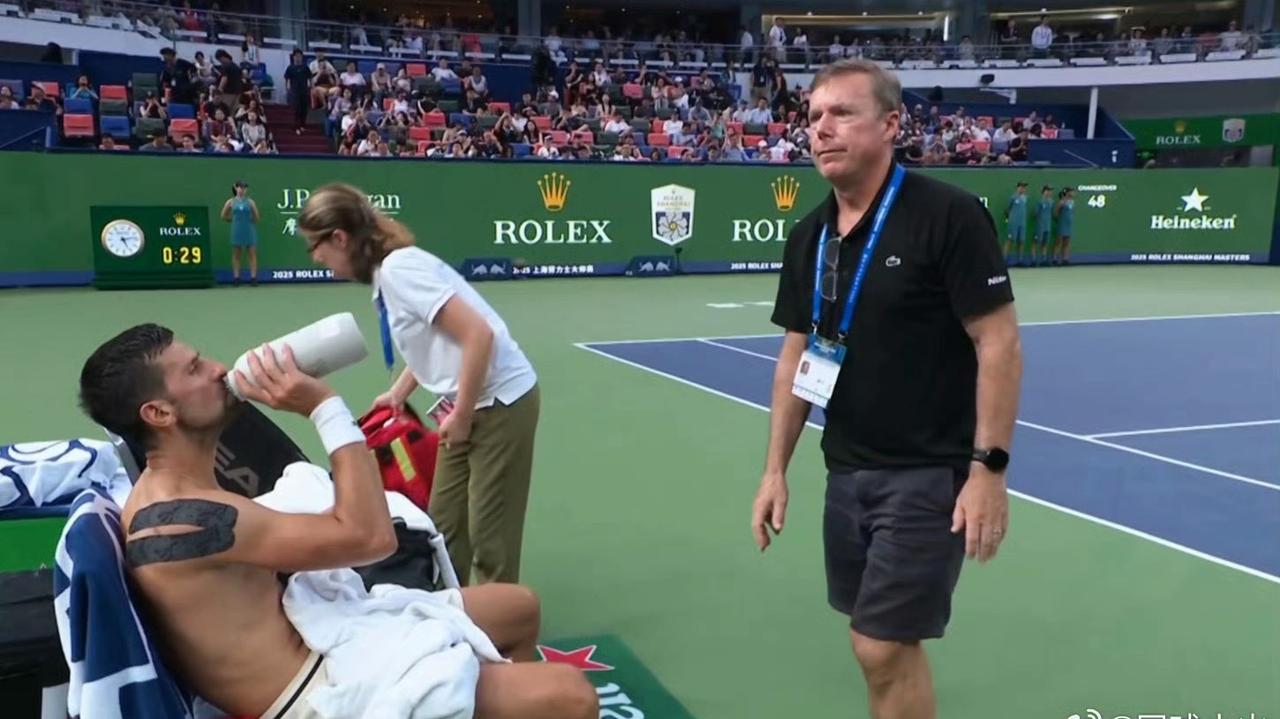 完了,德鸡危险!德约科维奇在首盘率先破发的情况下,被对方完成了几次破发,首盘3-6输了,目前大比分0-1落后! 首盘3-4落后时,还叫了医疗暂停,又吃了止疼片,腿按摩了好几次。 估计德鸡要退赛了,难道真的是表兄弟会师上海大师赛决赛?