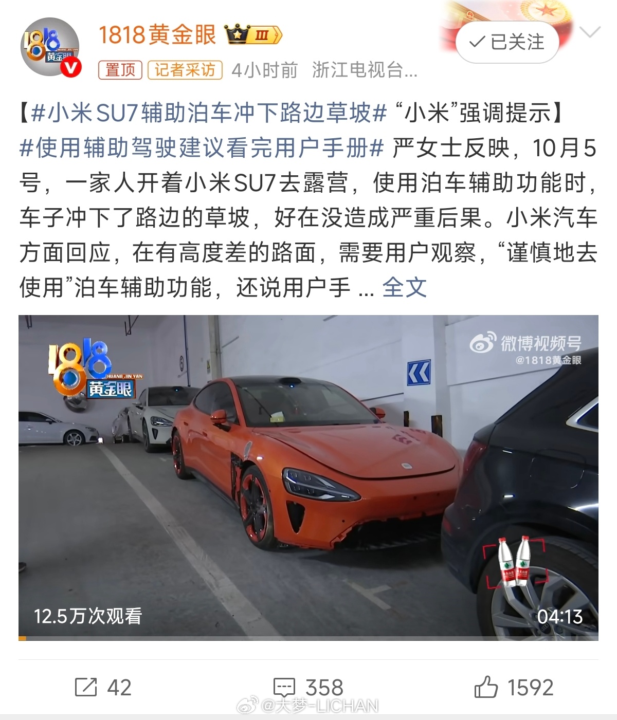 小米SU7辅助泊车冲下路边草坡看了一下这事儿,先给大家总结下经过吧,其实就是泊车使用不当引起的事故