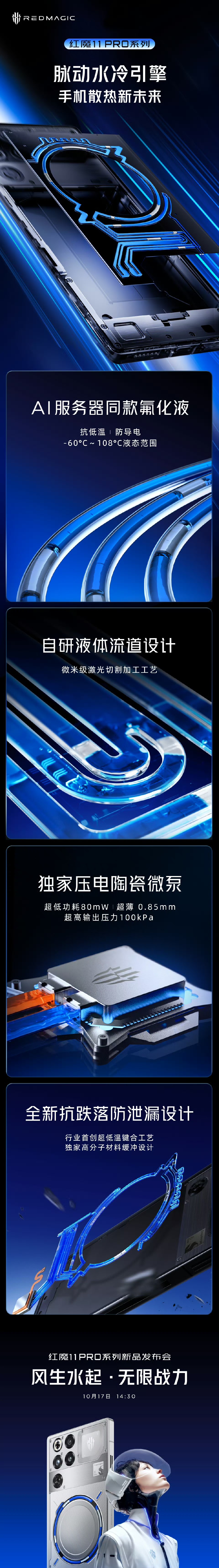 红魔首次在手机里灌进氟化液冷却液,绝缘抗冻还耐高温,-40℃到120℃都能淡定“游泳”。更绝的是用微米级激光切割掏出超精细流道,搭配“迷你心脏”压电陶瓷微泵,让冷却液像过山车一样疯狂循环,散热效率直接拉满。而作为风冷鼻祖,红魔更是把风扇直接卷到了24000转/分钟,再裹上纳米级气密性材料,居然实现了IPX8防水,想象一下:边泡澡边开黑,风扇在水里呼呼转,手机凉得像刚从冰箱拿出来,这操作简直离谱又上头。