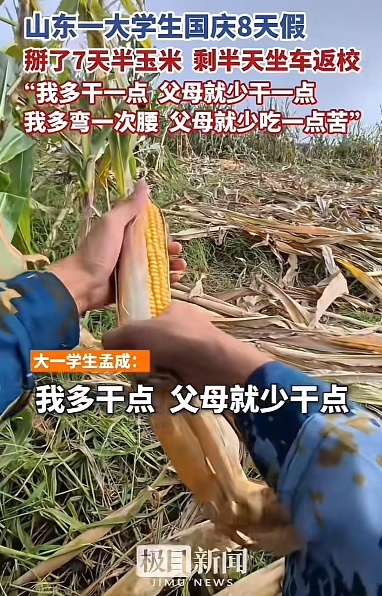 这个山东大学生火了!山东,男孩国庆8天假,掰了7天半玉米,剩半天坐车返校!他说:”,我多干点儿,父母就少干点儿,我多弯一次腰,父母就少吃一点苦!”网友:这样的孩子长大了肯定有担当有责任,肯定会幸福的。父母会少了很多辛苦! 这个国庆假期,一位来自山东的青岛农业大学大一学生孟成彻底火了!在别人尽情享受8天长假的悠闲时光时,孟成却一头扎进了秋收的“战场”,掰了整整7天半的玉米,最后仅留了半天时间匆匆坐车返校。 原来,今年秋收时节,老天爷似乎格外“调皮”,连降了好几场大雨。原本宽敞平坦的田地变得泥泞不堪,收割机根本无法开进田里作业。 而田里的玉米,再不收就要面临发霉或者发芽的命运。可孟成的父母在国庆期间还得忙着摆摊卖水果,维持一家人的生计,根本无暇顾及田里的玉米。 看着父母日益佝偻的背影和忙碌的身影,孟成心里一阵酸涩。他暗暗下定决心,一定要帮父母把玉米抢收回来,绝不能让父母半年多的辛苦白费。 于是,国庆假期一开始,孟成便一头扎进了玉米地里。 清晨,当第一缕阳光洒在玉米叶上时,孟成已经来到了地里。他挽起裤腿,弯下腰,双手紧紧握住玉米棒,用力一掰,“咔嚓”一声,一个玉米棒便被他掰了下来。 可这看似简单的动作,重复起来却并不容易。玉米叶像一把把锋利的小刀,在他的手臂上划出一道道细小的口子,汗水顺着脸颊流下来,流进伤口里,火辣辣地疼。 但孟成顾不上这些,他一心只想着多掰些玉米,让父母能轻松一点。 几天时间下来,他的双手因为长时间掰玉米而变得红肿,手指也磨出了血泡,每掰一下都钻心地疼。但他依然咬牙坚持着,一刻也不肯停歇。 有人路过看到他这么辛苦,忍不住问他:“孩子,累不累啊?” 孟成抬起头,回答:“不累,让父母少辛苦一点,我就感觉值得!” 孟成用沾满泥土的双手,书写了当代大学生最接地气的成长篇章。这份在泥土里锤炼出的坚韧和孝心,就像一颗璀璨的星星,在当今社会显得弥足珍贵。 他用自己的行动诠释了什么是责任,什么是担当,什么是真正的成长。他就像一束温暖的光,照亮了我们前行的道路,让我们看到了年轻一代的希望和力量。 这样的孩子,值得我们去赞美,去学习,他必将在未来的人生道路上绽放出更加耀眼的光芒!