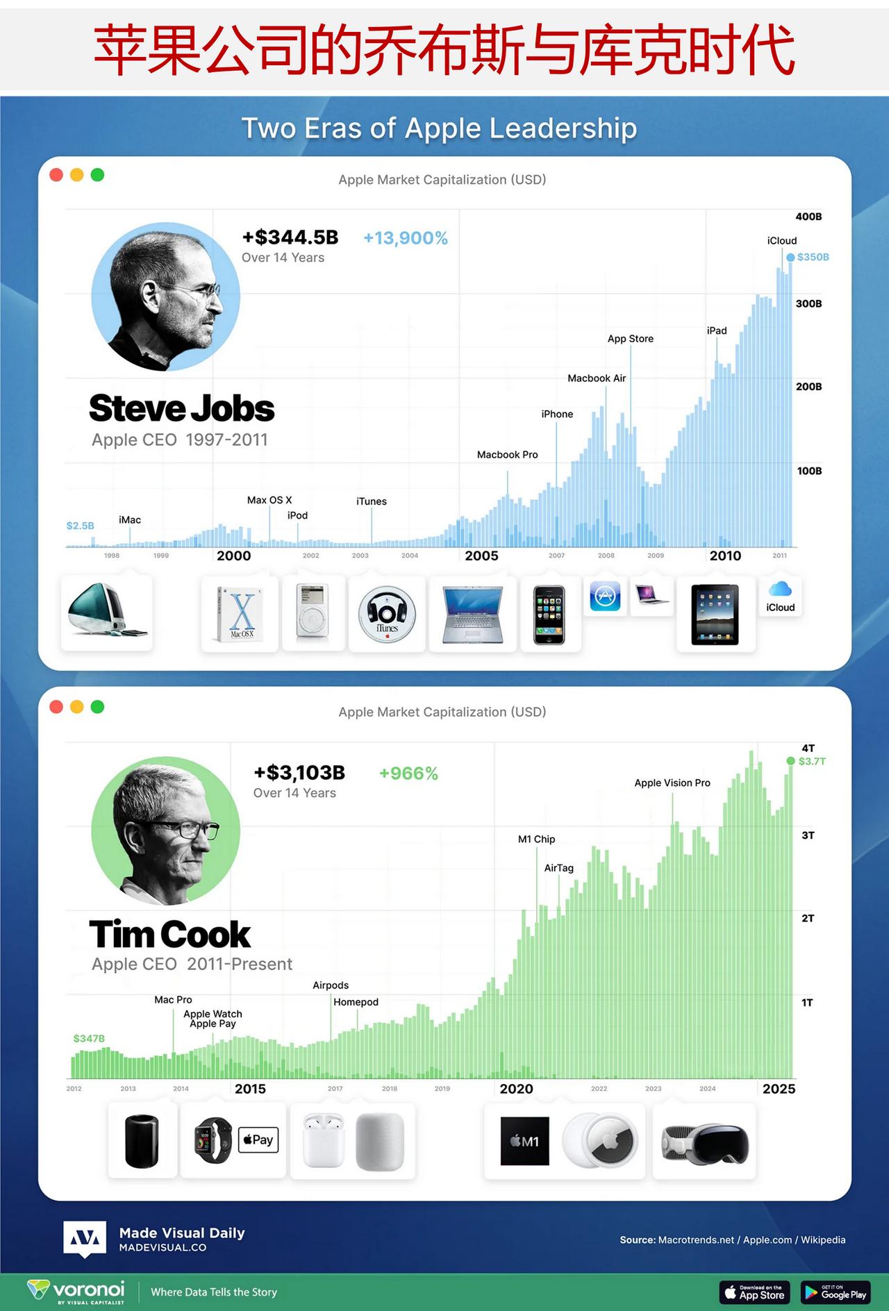 史蒂夫·乔布斯与蒂姆·库克:两位苹果公司首席执行官的对比分析 从一家艰苦创业的车库公司发展成为全球最具价值的公司,苹果公司的这段发展历程与其两位最具影响力的首席执行官——史蒂夫·乔布斯和蒂姆·库克——的功绩紧密相连。 下面图表将这两个时期进行了并列对比。它突出了关键的里程碑事件、产品发布以及公司的市值增长情况。这些数据均来自公开渠道。 在史蒂夫·乔布斯的领导下,苹果公司的市值从 25 亿美元飙升至 3500 亿美元,这得益于诸如 iMac、iPod、iPhone 和 iPad 等具有标志性的产品发布。与此同时,蒂姆·库克带领公司实现了惊人的 3.1 万亿美元的增长,到 2025 年公司市值达到 3.7 万亿美元,得益于服务、AirPods、苹果芯片以及甚至苹果 Vision Pro 等产品。 ——乔布斯:产品创新者 乔布斯于 1997 年重返苹果公司,当时公司正处于危机之中。在接下来的 14 年里,他推出了众多具有突破性的产品,这些产品彻底改变了各个行业——从最初的 iMac 和 iPod 到具有革命性的 iPhone 和 iPad。 这些远不止是些小玩意儿——它们彻底改变了人们与科技进行交互的方式。2008 年应用商店的推出也为苹果公司庞大的软件及服务生态系统奠定了基础,如今这一生态系统已成为该公司的重要盈利来源。 ——库克:攀登者与谋划者 2011 年库克上任后,许多人质疑苹果是否还能持续创新。但库克的运营才能使公司得以在全球范围内扩张、优化利润并拓展收入来源。在他的领导下,苹果推出了 Apple Watch、AirPods、Apple Pay 和定制芯片(M1 芯片),同时大幅拓展了其服务业务领域。 如今,苹果的生态系统涵盖了硬件、服务、娱乐以及金融领域。库克成功地引领公司开拓了新的增长领域,帮助其应对了诸如供应链危机和智能手机增长放缓等挑战。 ——领导力的持久力以及“接下来该做什么”的问题 库克目前在苹果公司的任职时间比乔布斯还要长。他那种低调、务实的领导风格经受住了考验,即便在全球局势动荡的情况下依然稳健前行,并且继续扩大苹果在亚洲、医疗以及人工智能领域的业务版图。 但随着他的任期逐渐接近尾声,人们的注意力开始转向接班人问题。一些分析人士认为首席运营官杰夫·威廉姆斯或服务部门高级副总裁埃迪·库伊可能是合适的人选,而另一些人则猜测像约翰·特纳斯或克雷格·费德里吉这样的后起之秀可能会接任。 随着苹果公司下一阶段的发展拉开帷幕,其目标依然十分高远:库克将全球最具创新力的公司转变为最具价值的公司之一。接下来的领导者必须为公司的持续发展和创新转型指明方向。 正如 2023 年美国全国广播公司财经频道对该人物的报道中所指出的那样,库克强调团队合作,并期望公司各级都能实现创新。无论谁接任下一任领导职务,都需要在苹果公司保守的行事风格与不断变化的科技环境(从人工智能到增强现实)之间找到平衡。