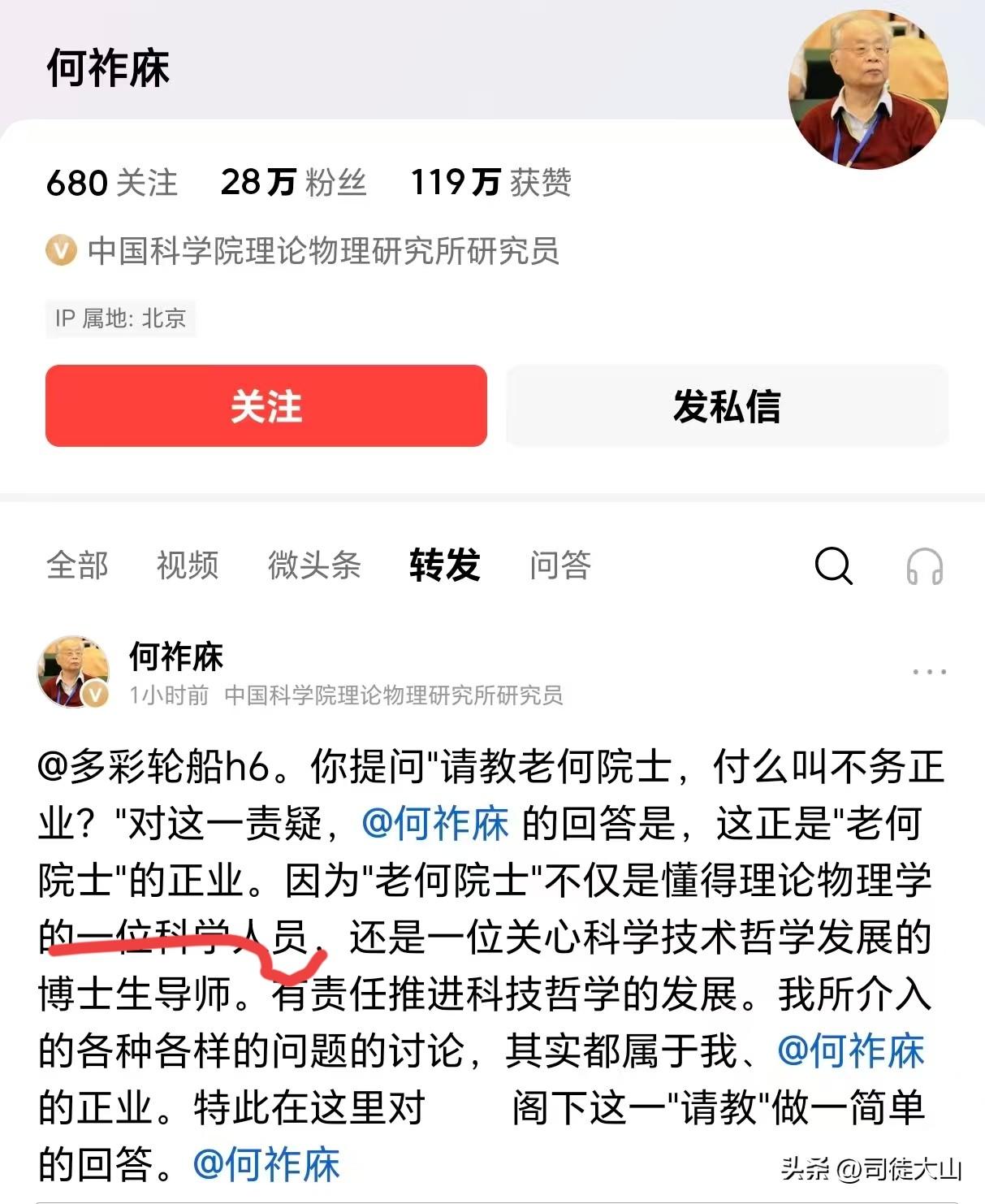 刚刚,何祚庥自称是一位科学人员 刚刚一小时前,何祚庥院士在回答一个网友“什么叫不务正业”提问时,他说:因为“老何院士”不仅是懂得理论物理学的一位科学人员,还是一位关心科学技术哲学发展的博士生导师。何祚庥这次虽然没自称是“科学家或者哲学家”等等,但还是不忘强调自己是“博士生导师”。总体上,不管怎么讲,何祚庥能够自称自认是“一位科学人员”是好事!你们怎么说?