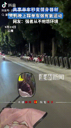 “强者从不抱怨环境”!云南,视频中一大妈晚上坐在共享单车上踩单车做有氧运动。