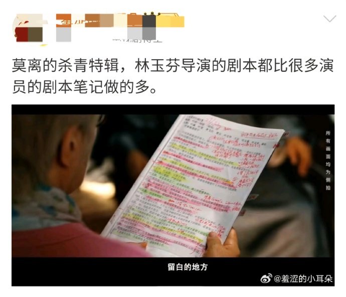 看到林导剧本上密密麻麻的笔记就有被狠狠震惊到,这种认真的工作态度是真的会让我们观众肃然起敬!感觉林玉芬真的很会教人演戏,特辑里看导演分析人物性格的那个透彻,就知道林导专业这方面没得说!有这么严谨的导演在,我会燥候莫离 这对救赎感cp!