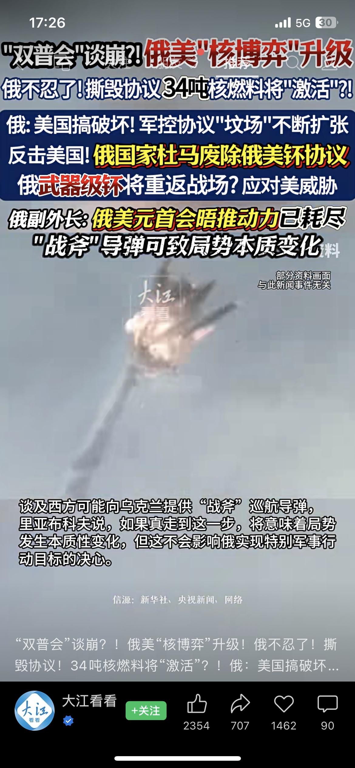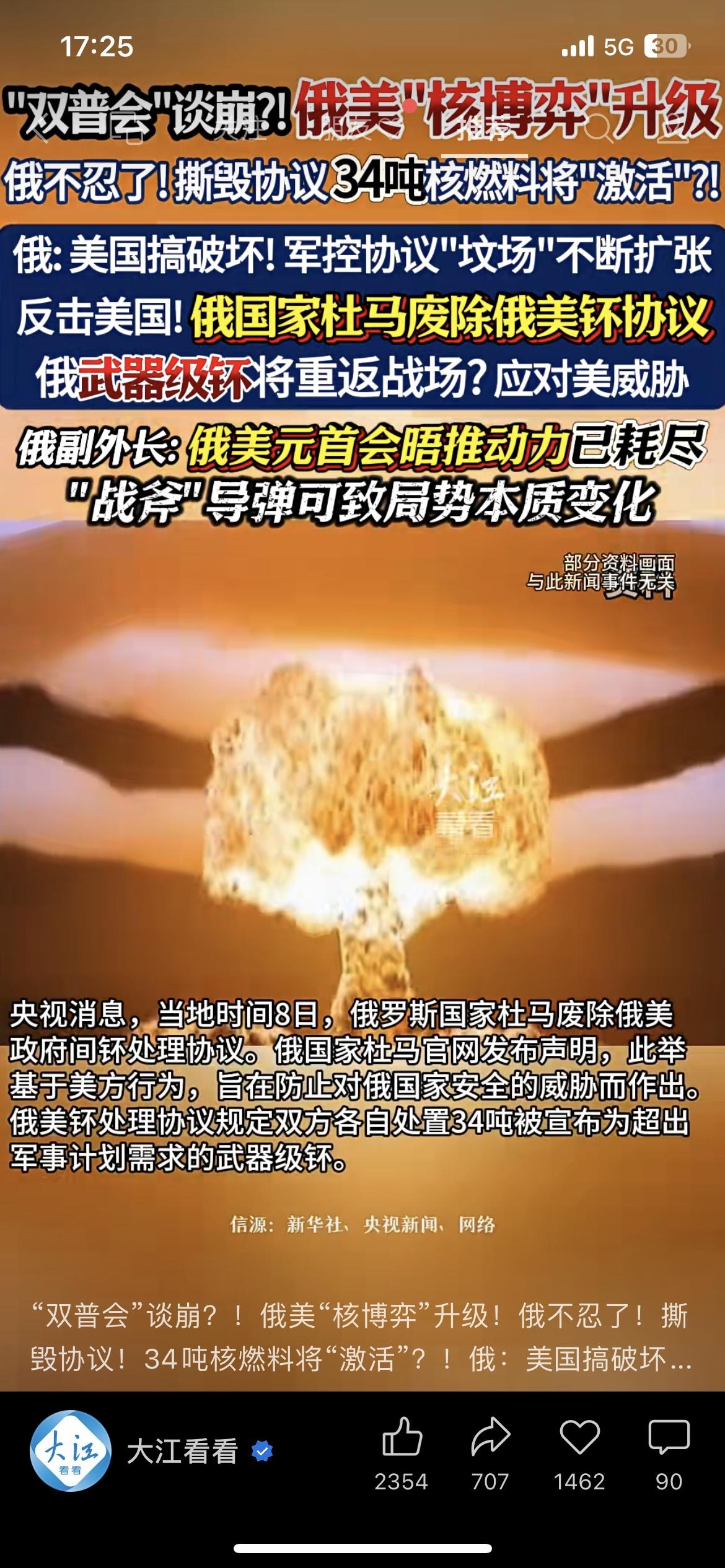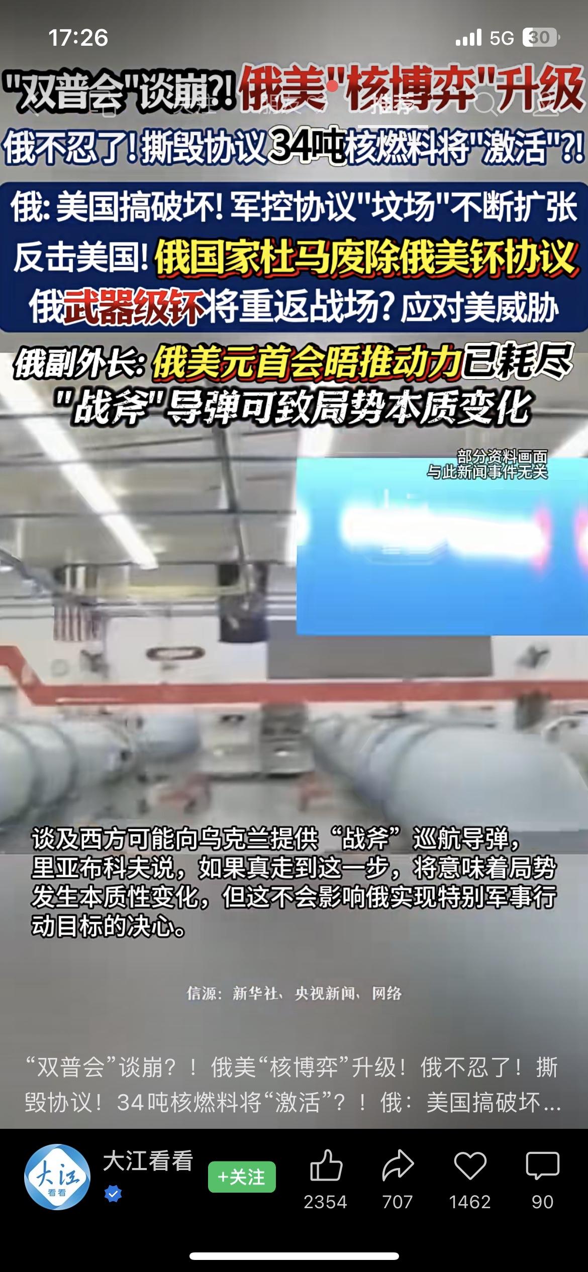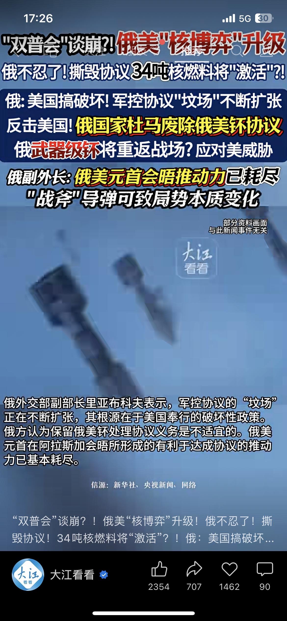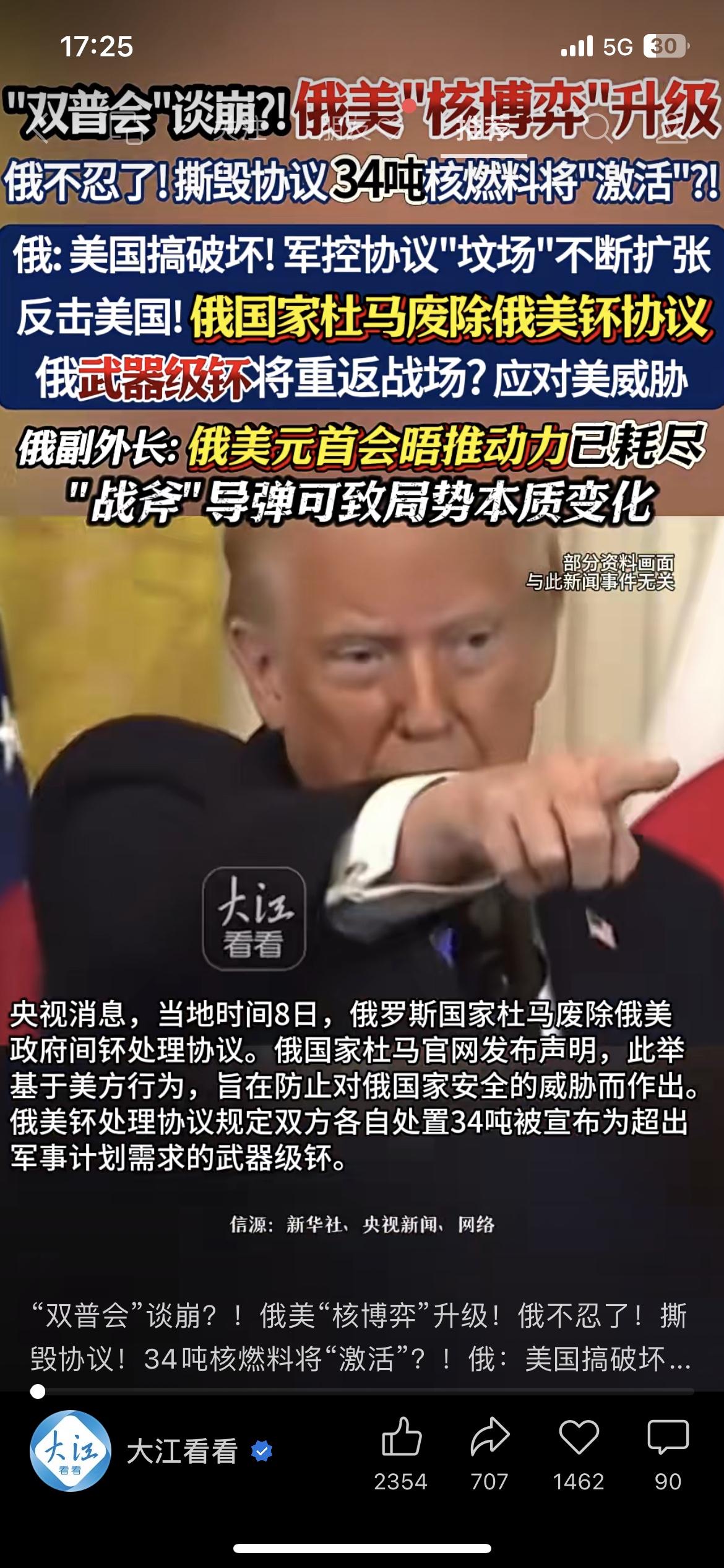 俄美核博弈升级!撕毁协议,34吨核燃料将“激活”?黄金会跟着涨吗? 核武器博弈 美俄核威慑叫嚣 美俄协议 地缘核博弈 美俄核军备谈判 家人们,俄美之间的核博弈突然升级了!俄罗斯国家杜马把俄美钚处理协议给废了,34吨武器级钚可能有新动作。俄副外长还说,俄美元首会晤的推动力已经没了,要是西方给乌克兰送“战斧”导弹,局势可能彻底变样。 这种紧张局势下,黄金作为避险资产,大概率会受关注。你觉得黄金会跟着涨吗?这局势后续会咋发展?评论区聊聊! 话题标签:俄美核博弈 黄金避险