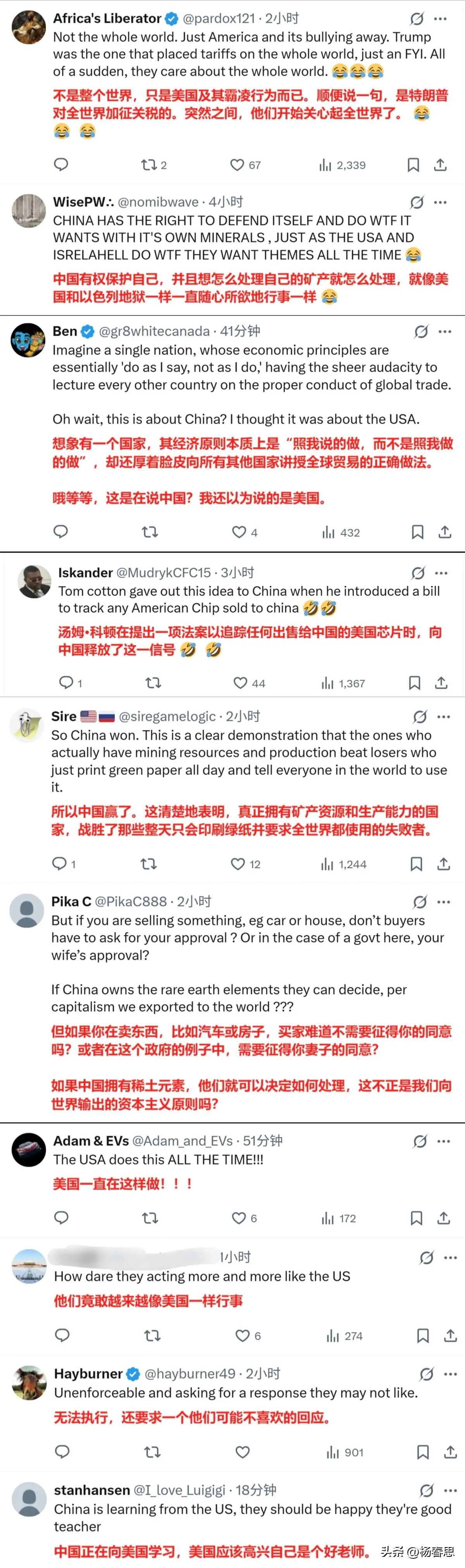 中国对稀土产品和技术的管控达到了美国的死穴上了。原来美国人也像我们一样被人打了反击了他们也会感到痛。寇可往我亦可住,以其人之道,反治其人之身。美国向来长臂管辖 ,中国现在也学习美国长臂管辖他们就受不了了。所以对付美国,只要用他们听得多语言进行反击,其他话就不要说了。