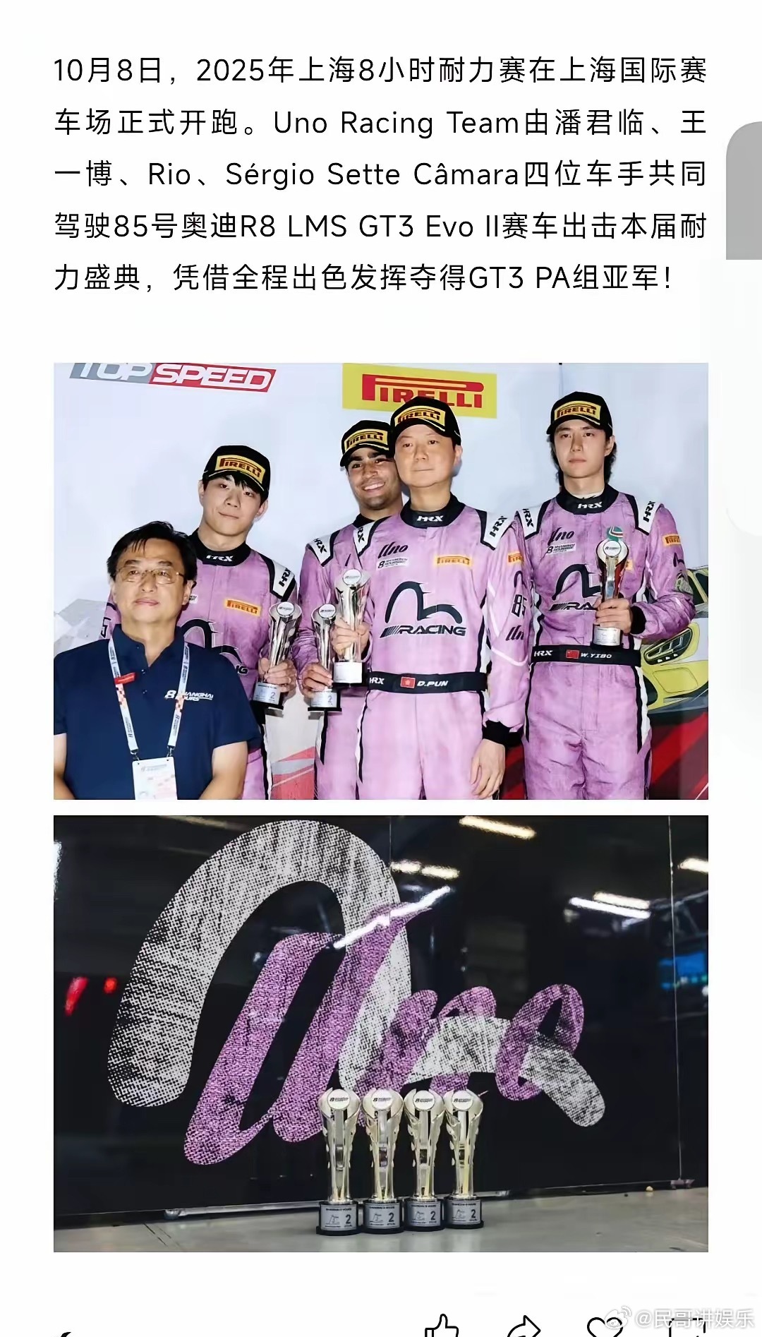 Uno车队发长文,总结了王一博在上海8小时耐力赛的表现,并且总结了赛车被撞受损的原因,就是对方超车失误(图三)。