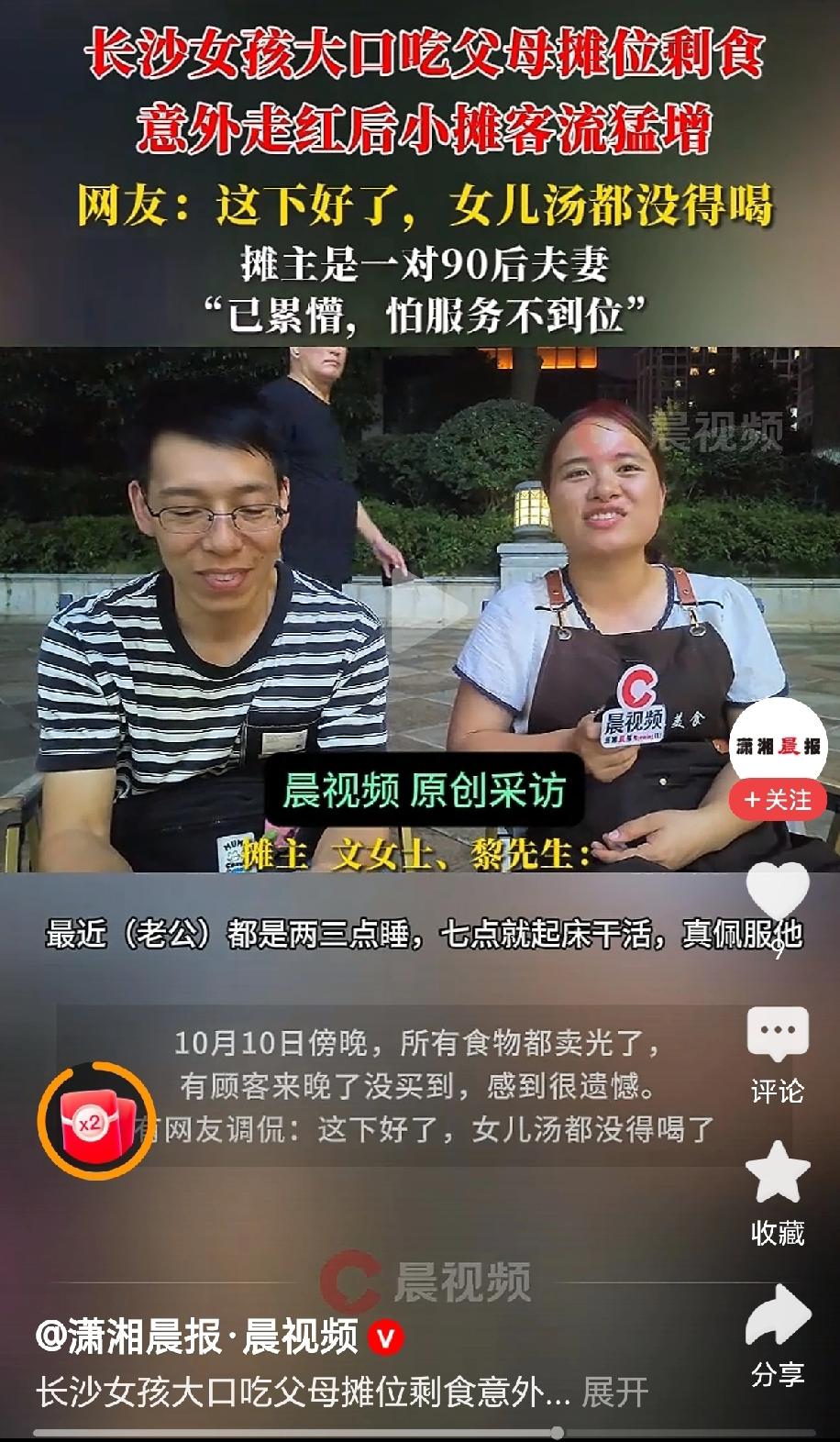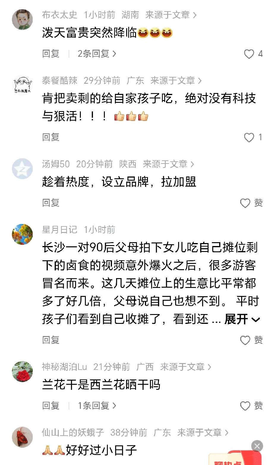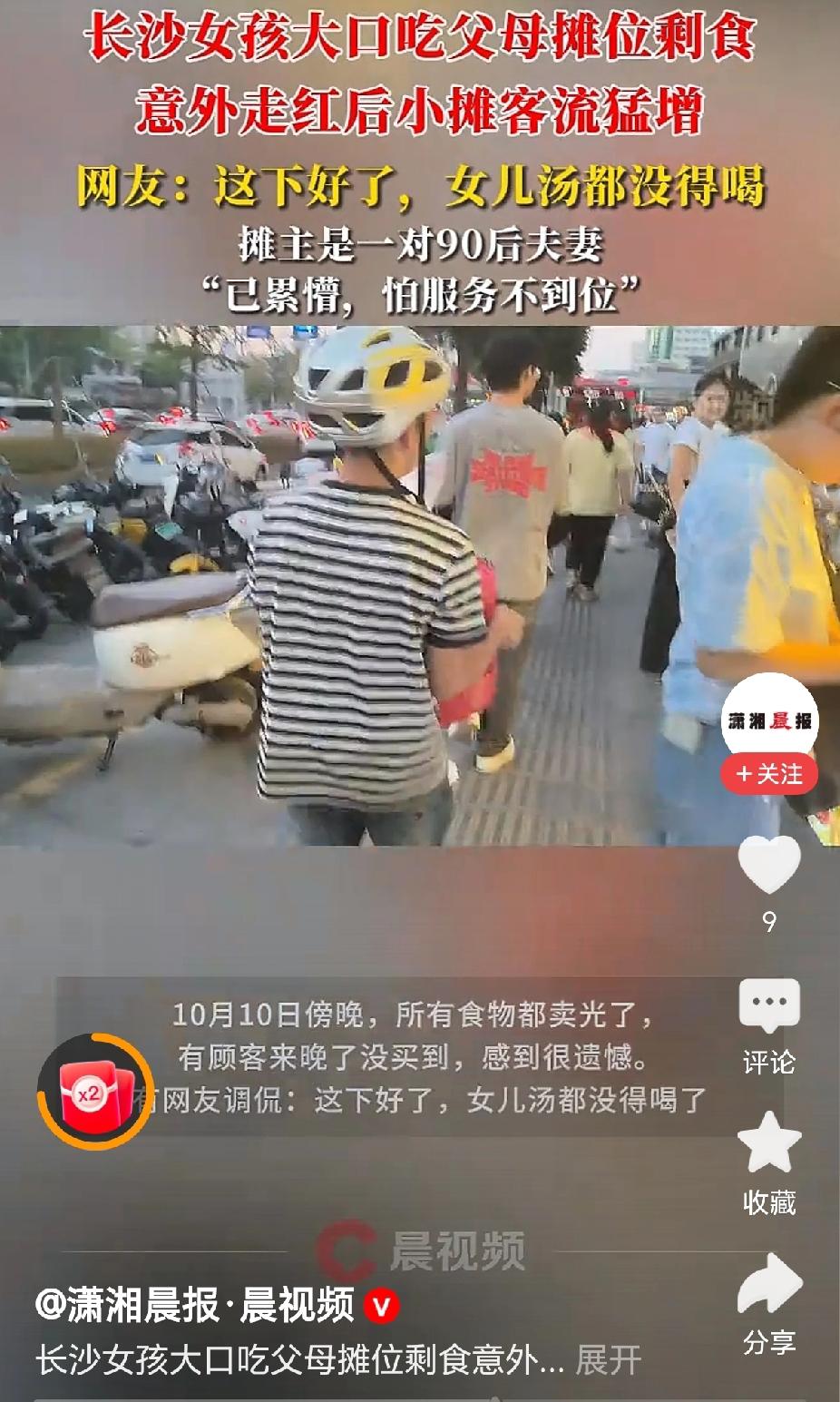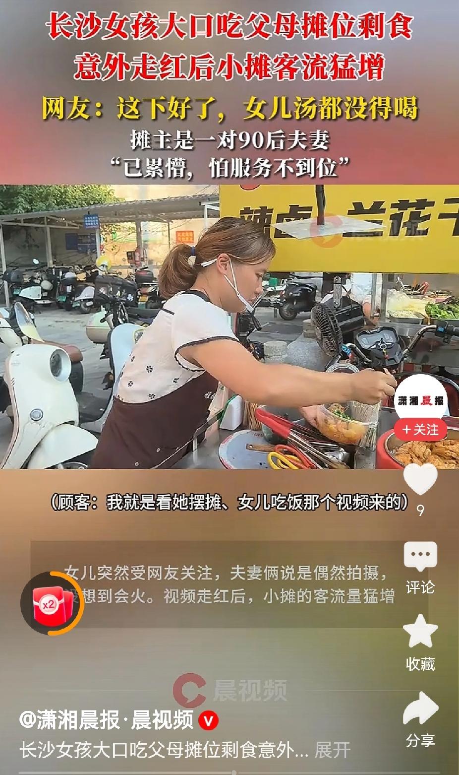 “走红了,90后夫妻小摊剩食让女儿吃的视频火爆了!”近日,湖南长沙,一对年轻的夫妻在街头摆卤味小摊,上学的女儿做作业回家的时候,和同学来到爸妈摊位上,吃得津津有味光盘了!(来源,潇湘晨报) 据媒体采访报道,一对90后的年轻夫妻在长沙街头摆卤味小摊创业,有一天女儿和同学做作业回家,来到摊位上,就着摊前的餐桌,欢快的吃起了面条和卤味。 摊主将这一段视频发布在个人账号上,很快就引起了大家的关注,连续几天生意都非常的火爆。“没想到这几天累蒙了,生怕服务不周到!”摊主夫妇接受采访时说! “这下好了,女儿连汤都喝不到了!”有网友评论说,那说明他们家的食品很干净,能给自己的女儿吃! “趁着这波流量注册商标,打出品牌!”有网友建议,这是一波破天的富贵呀,你趁着热度创立品牌,拉起加盟! 是呀,这一个流量的时代,食品卫生过硬的条件下,是很能够引起大家的共鸣,好好过小日子! 对此,你的看法是怎样的呢? 女儿吃剩食带火爸妈小摊 @秋实99 关注人生冷暖,拥抱幸福生活!