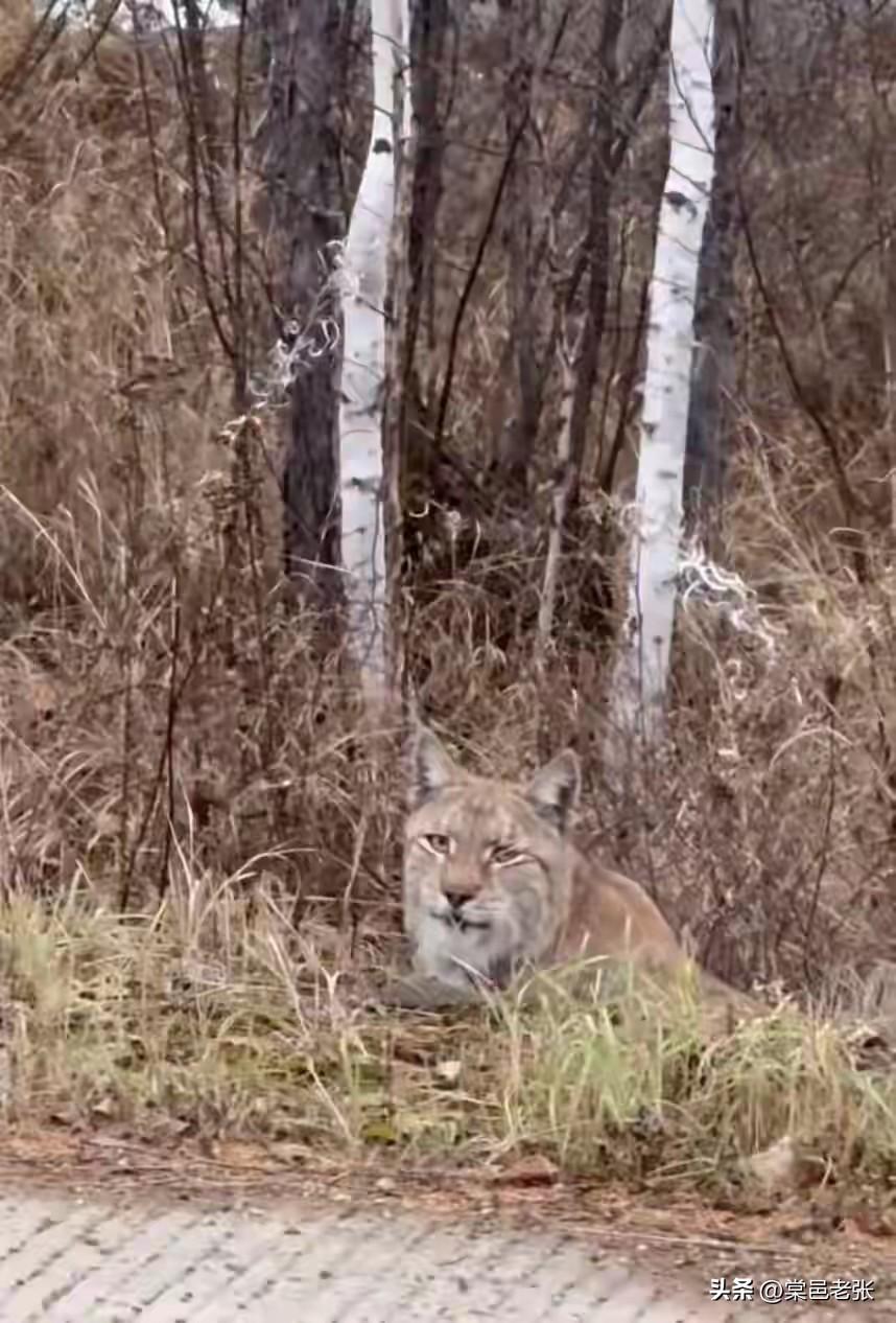 10月10号在黑龙江大兴安岭,有一家人自驾时碰到超有趣的一幕。一只野生猞猁卧在路
