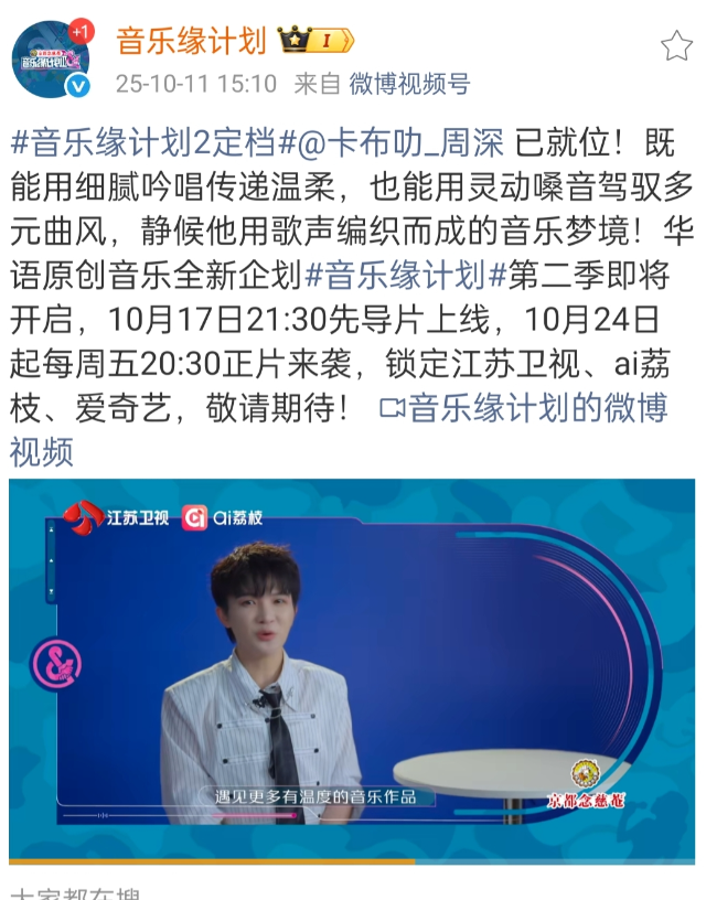 说一个好消息,《音乐缘计划2》定档了,10月17日21:30先导片上线,10月24日起每周五20:30正片开播! 太好了!每周五晚上的快乐又回来了![呲牙][鼓掌]