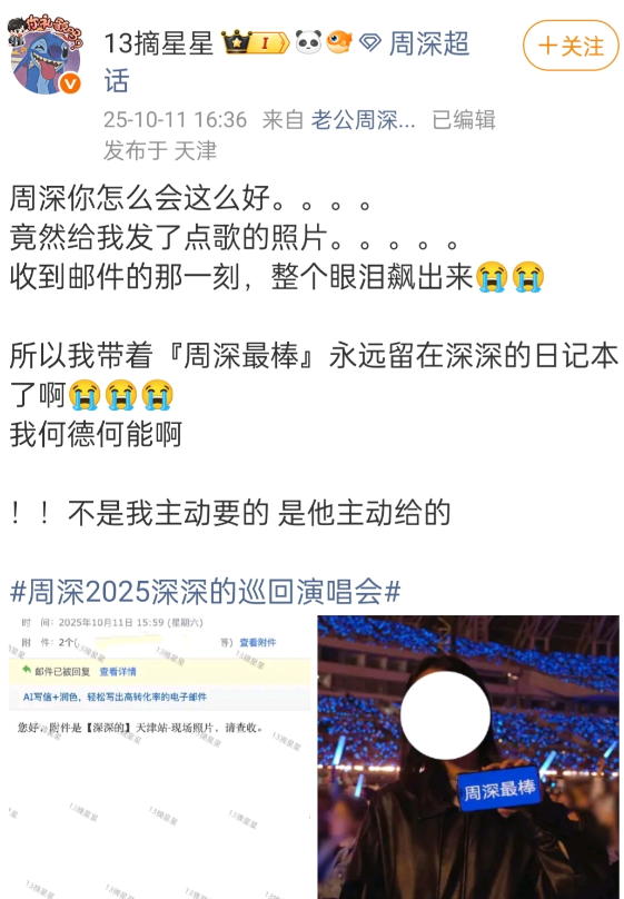 其实上海场刚开始有这个环节的时,周深就有说过:留下联系方式工作人员会把照片发给你! 不过之前都没有看过反馈的,这是我看到的第一个返图,周深真的太好了!