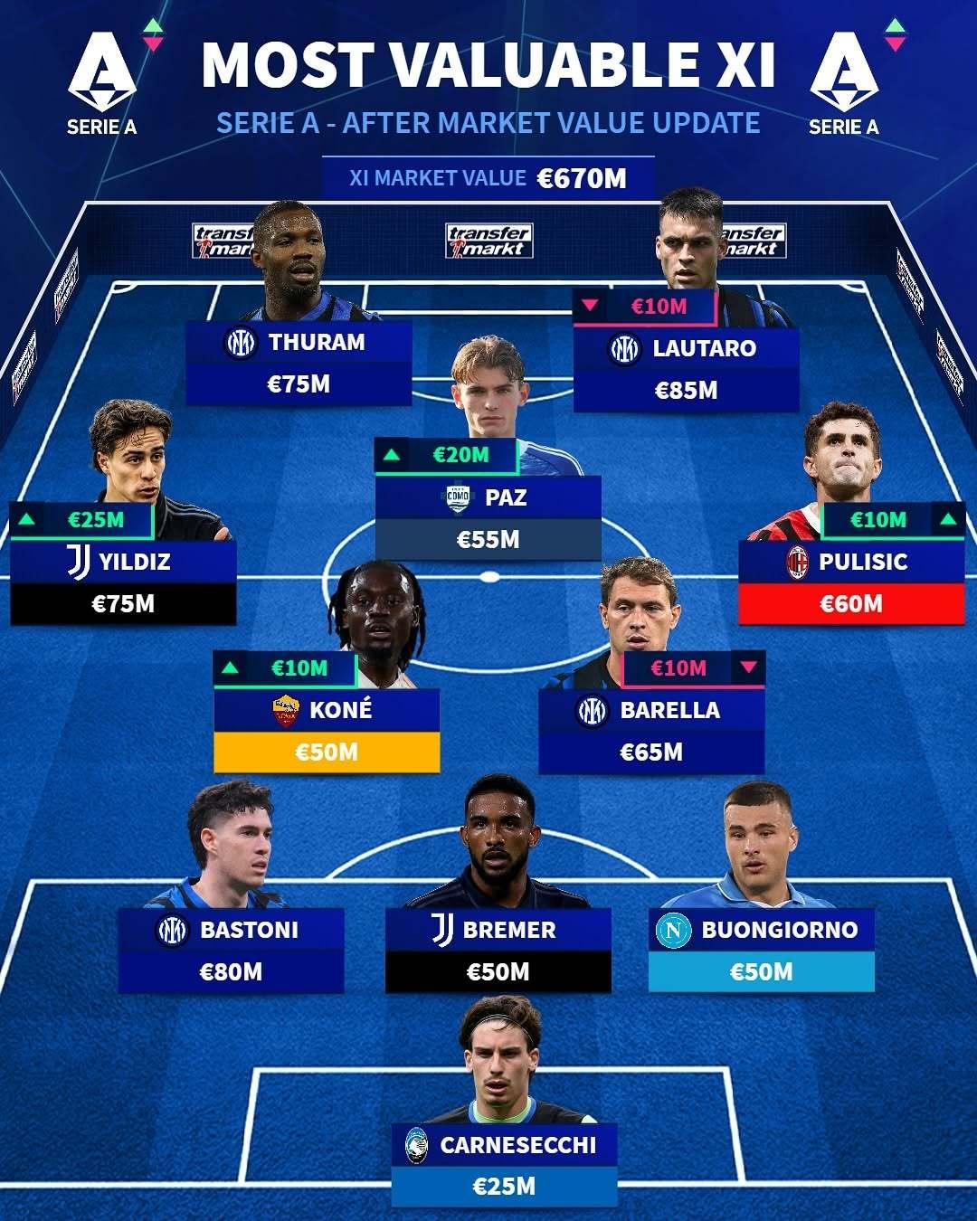 最新德转身价! ★亿元金球先生! 登贝莱的身价再次涨到1亿欧,此前法国人身价最低时只剩3000万欧,上次身价达到1亿欧元,还是2019年在巴萨的时候。 ★得益于欧冠冠军荣誉,巴黎队内很多球员的身价都上涨了1000万欧元以上。 ★现在五大联赛中只有意甲没有亿欧身价的球员,意甲标王还是劳塔罗,身价8500万欧元,降了1000万欧元,距离亿元门槛越来越远。 ★20岁尤文前锋伊尔迪兹身价上涨至7500万欧元,刷新了皇马中场居莱尔只保持了5天的土耳其球员身价纪录! ★摩纳哥前锋法蒂的身价从500万欧涨到1000万欧,本赛季5场6球,状态回暖,法蒂2021年时身价曾达到峰值8000万欧元,但随后一路下滑,直到谷底。 ★27岁米兰边锋普利西奇身价上涨至6000万欧,时隔5年追平生涯纪录。 ★皇马中场卡马文加身价4连跌,目前仅有5000万欧,巅峰时曾达到1亿欧。 ★夏窗闹了半天也没能离开的卢克曼,身价跌了2000万,现在只有4000万。 ★两年前曼联从国米引进奥纳纳时花费了5020万欧,球员目前德转身价仅为2000万欧。