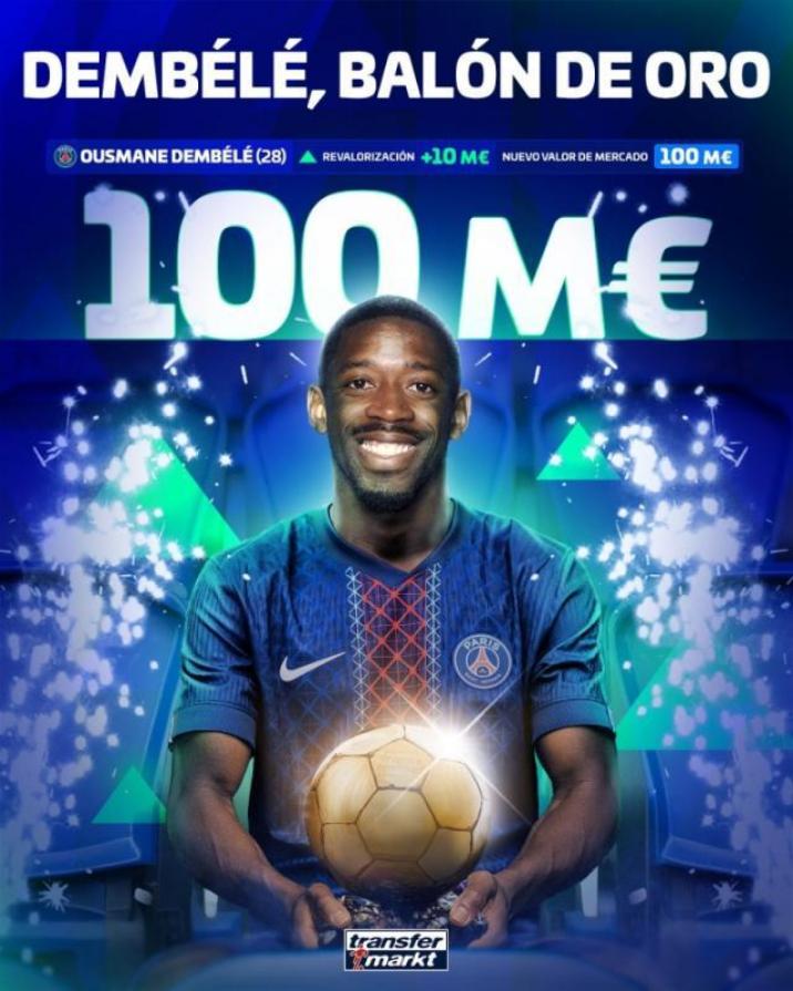 最新德转身价! ★亿元金球先生! 登贝莱的身价再次涨到1亿欧,此前法国人身价最低