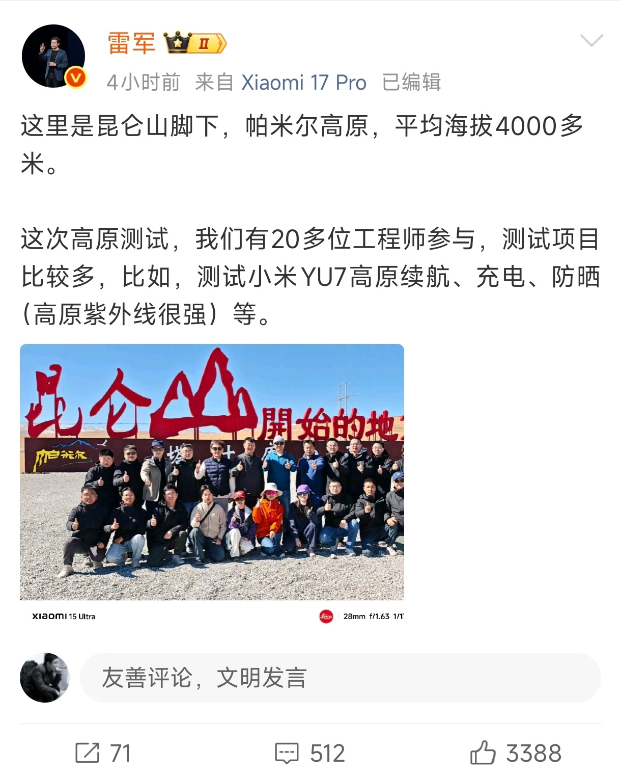 当然,雷总的微博中的“昆仑山”也几乎就是明示了除了YU7之外,小米还要额外测试就是即将面市的小米增程大车了,高原环境对汽车发动机的能力有着非常大的考验,期待呀!