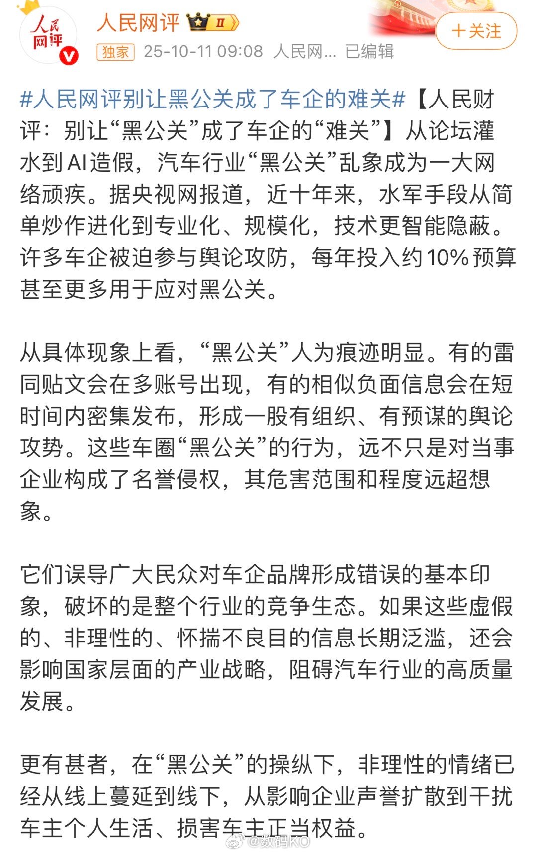 人民网评别让黑公关成了车企的难关,更有甚者,在“黑公关”的操纵下,非理性的情绪已