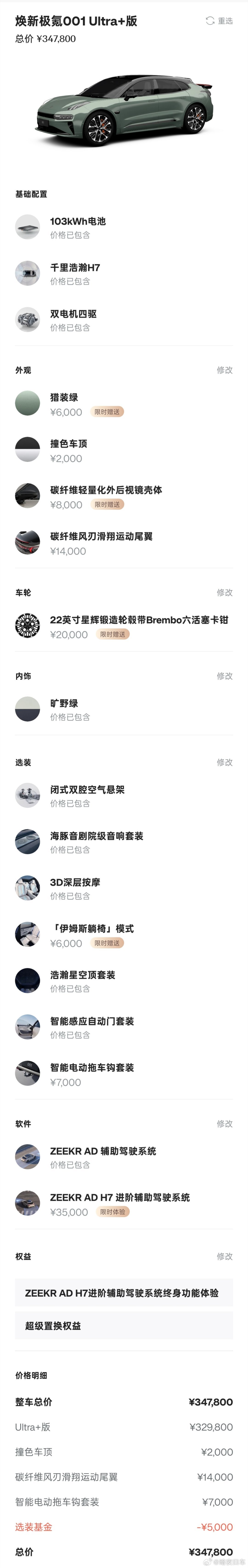 回看我的第一台极氪001的订单,当时选满了以后也是38万多的价格,应该说在那个时间点,极氪001也是我非常心仪的一辆悦己之车,虽然最后因为后轮转向和投影大灯,无线充电选择了智己L7,但极氪001的底盘调校和动力表现仍然令我惊喜不已。