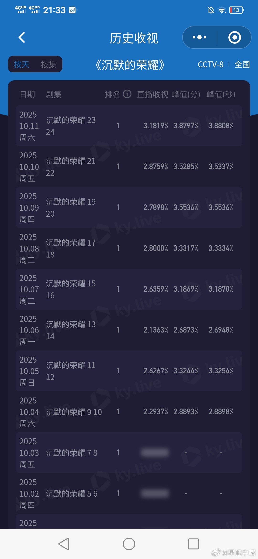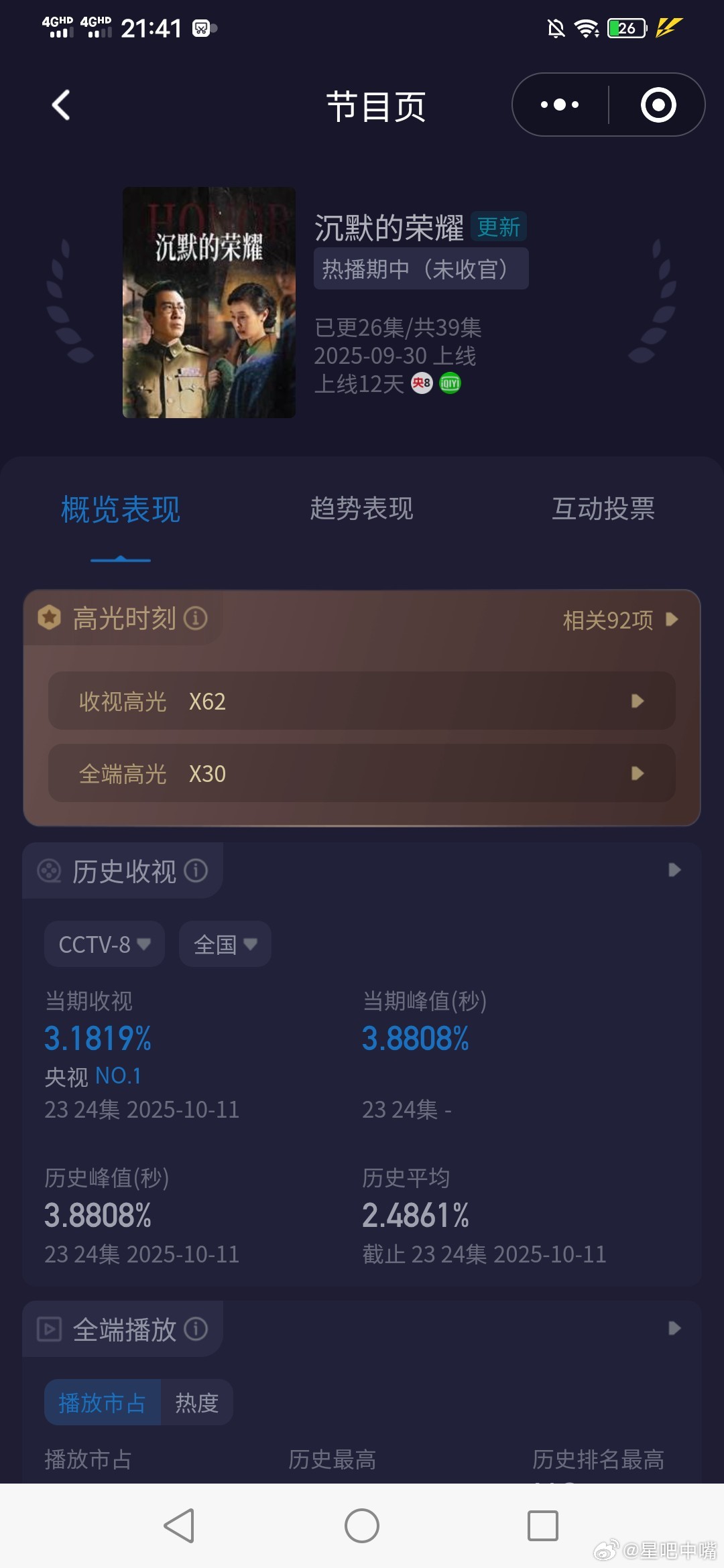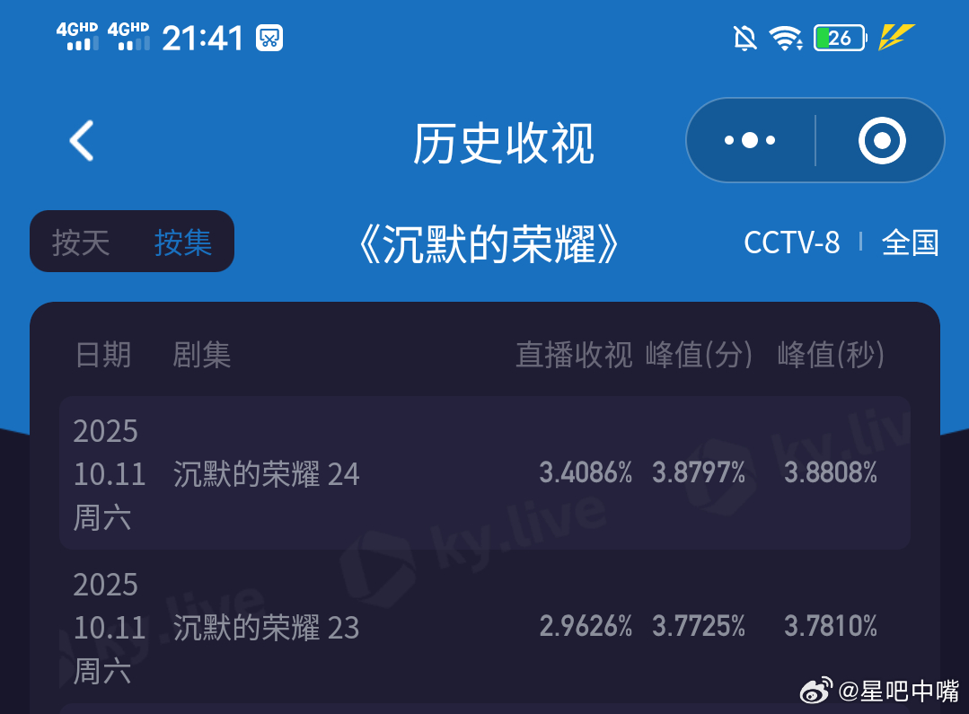沉默的荣耀即将破4! 周六收视又又又新高了!《沉默的荣耀》今晚酷云峰值3.8808,双集平均3.1819,开播以来双双新高!明天酷云要破4了!