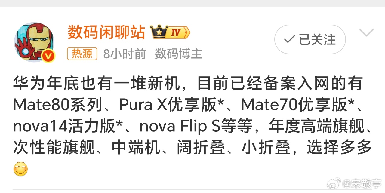 华为年底也有一堆新机今年旗舰压轴出场的基本是华为了,华为Mate80系列、华为MateX7系列等硬核电子年货,应该又是承包2026年春晚的产品[哈哈]!