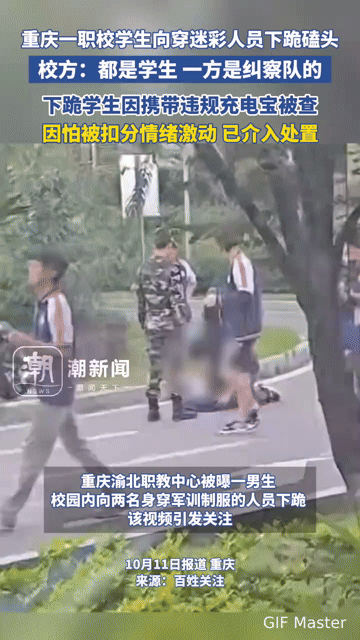 重庆职校生因违规充电宝下跪磕头,这一幕为何让人唏嘘? 你能想象吗?一名职校生只因携带违规充电宝,竟当街向穿迷彩的同学下跪磕头! 10月11日,重庆渝北职教中心的这一幕引发关注。涉事学生因携带违规充电宝被校纠察队(队员也是学生)查到,因怕扣分情绪激动做出下跪举动。校方称已介入处置,学生干部也是第一次遇到这种情况,当即求助老师。 这事儿是不是挺戳心?校园管理的尺度与学生心理承受力该如何平衡?你觉得遇到这种情况,怎样处理才更妥当?