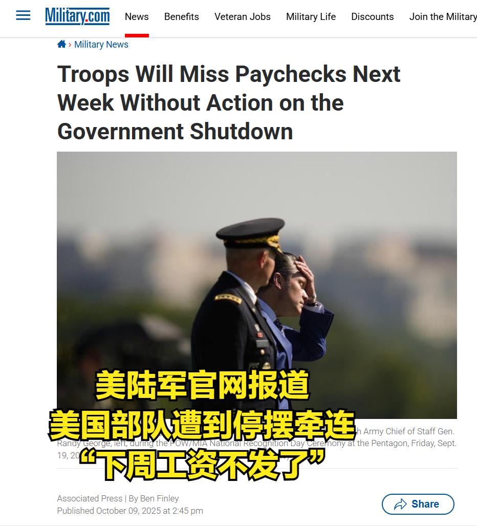 难以置信,美军连发饷都困难了? 由于债务超限问题美国会两方谈不拢,美国公共行政