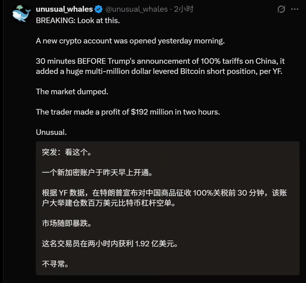 美国突然出现一个神秘的比特币大空头,在特朗普宣布对要对中国征收100%关税的前三十分钟,这个神秘账户就突然建仓做空比特币,随后比特币就暴跌,于是这个神秘账户在两个小时内,就狂赚了1.92亿美元。 哪怕是傻子都能够看出来其中的猫腻,毫无疑问这个神秘账户多半是特朗普团队的核心成员,提前掌握了内幕消息,因此才建立了一个比特币的空头账户。 随着越来越多的信息浮出水面,现在这个神秘账户已经在外网彻底火了,许多美国人都无比愤怒,感觉特朗普团队是在操纵市场,导致他们血亏,任是谁也没有想到,作为堂堂美国总统,做事竟然这样毫无下限。