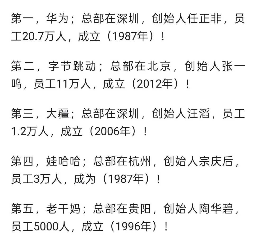 我国还有五家超牛的未上市民营企业。华为,深圳巨头,任正非创立,20.7万员工,5G技术全球领先;字节跳动,北京新秀,张一鸣打造,11万员工,旗下抖音、今日头条火遍全球。大疆,深圳科技先锋,汪滔掌舵,1.2万员工,无人机领域称霸。娃哈哈,杭州老牌,宗庆后带领,3万员工,饮料市场屹立多年。老干妈,贵阳传奇,陶华碧一手撑起,0.5万员工,辣酱畅销海内外。 它们不上市,把企业当事业,为社会做贡献,境界不是一般上市公司能比的。