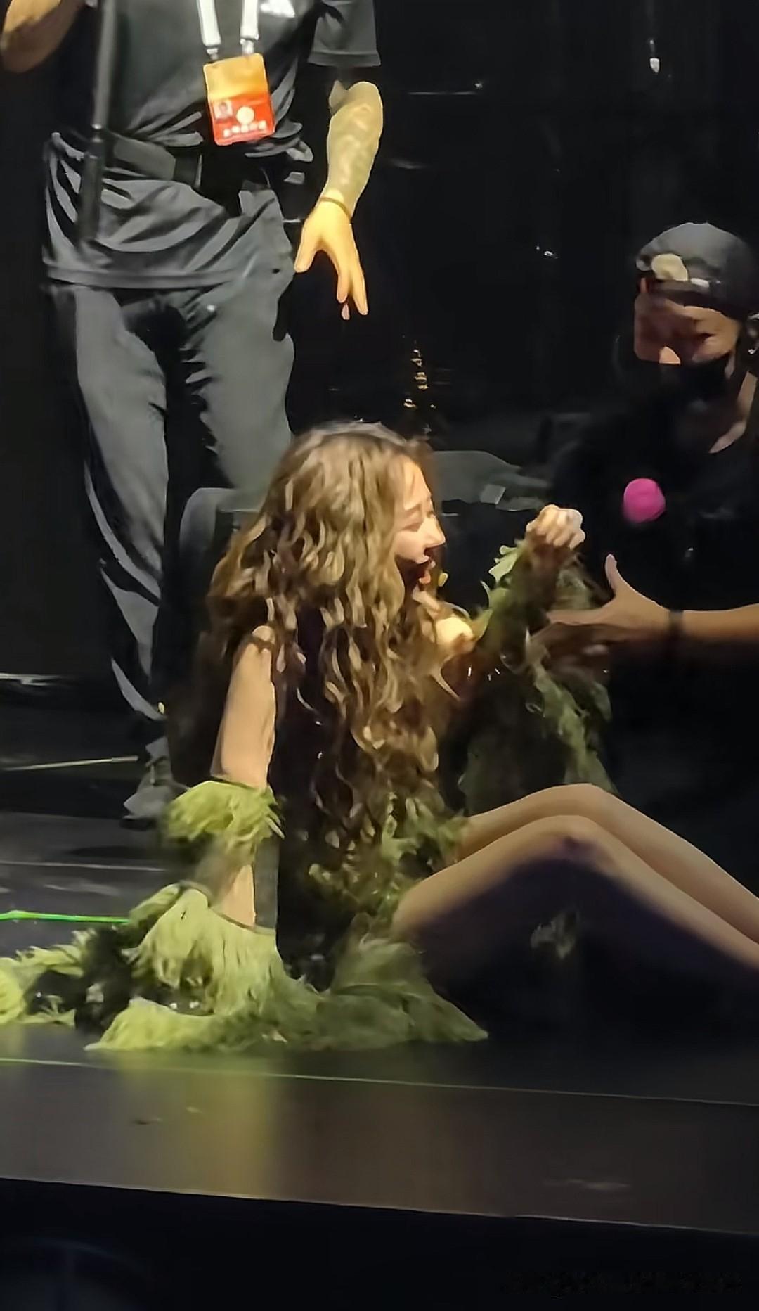 注意看,张靓颖从舞台摔下去的时候,是坐在地上的,这应该是快摔的时候本能反应跳了下