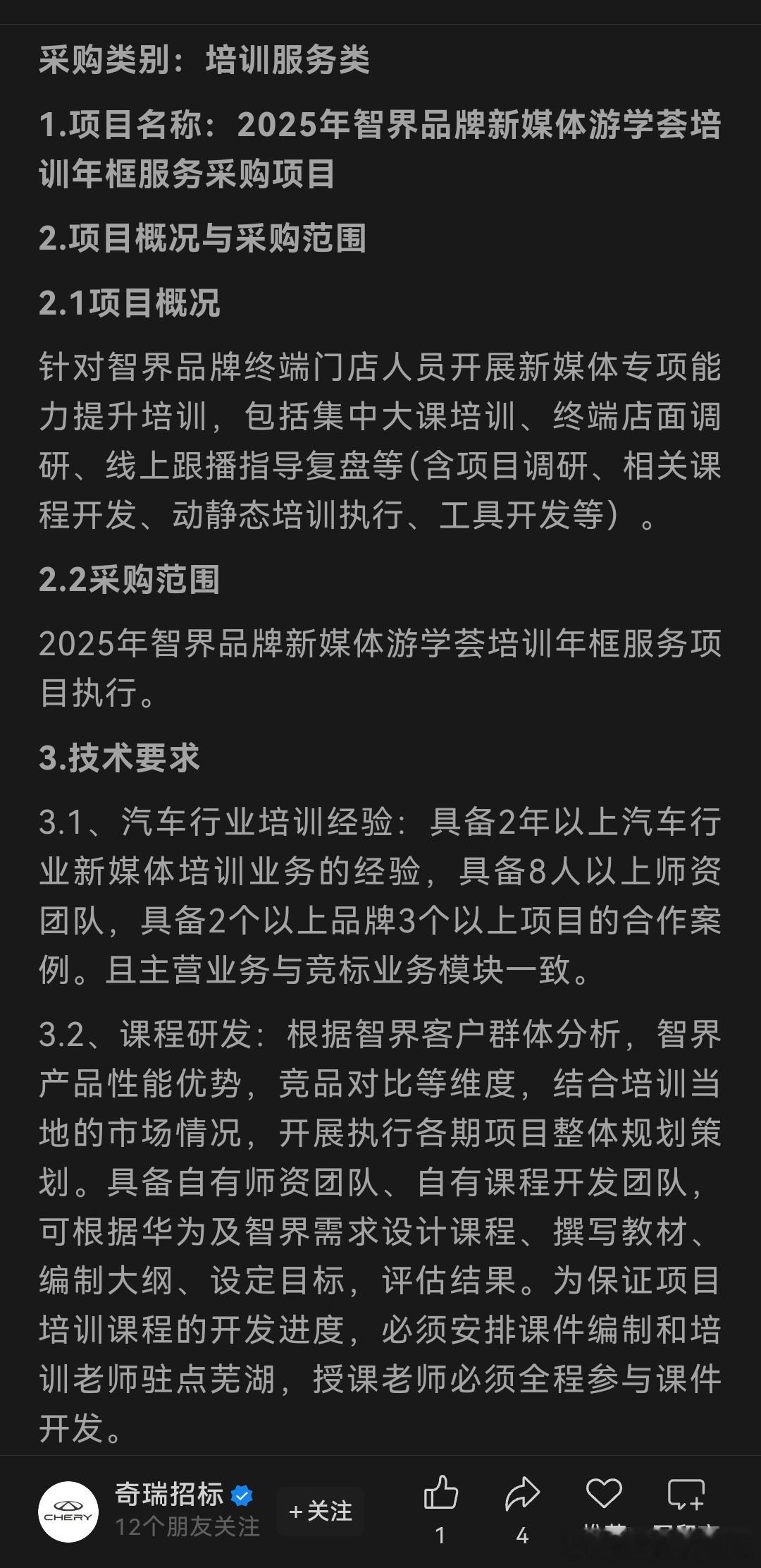奇瑞招标中显示,项目采购是终端门店的培训课程