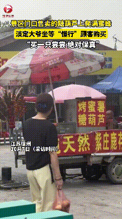 江苏徐州一景区门口售卖的糖葫芦上竟爬满蜜蜂,大爷淡定的坐在旁边等“懂行”的顾客购