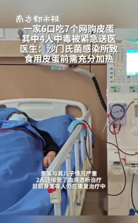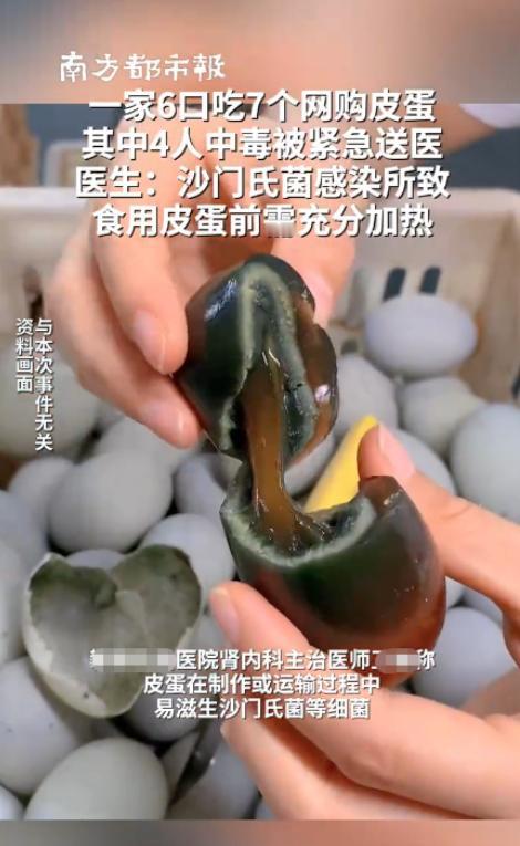 “悲剧还是发生了!” 近日,四川西昌,一女子网购了些皮蛋,收到货 后,她还特意检查了包装有没有破损,没发现问题才拿出 7 个分给家人当开胃菜; 她老公当时还调侃 “网购的皮蛋就是方便,不用跑菜市场”,谁能想到这方便背后藏着风险; 刚开始大家吃得挺开心,还说这皮蛋口感细腻,蘸点醋特别香,可没过二十分钟就有人不对劲了; 她儿子先喊肚子痛,接着就往厕所跑,没多久就开始呕吐,脸色白得像纸一样; 她自己也觉得胃里难受,浑身没力气,婆婆更是直接坐在椅子上动不了,说话都没声音; 最吓人的是她女儿,突然眼睛一闭就昏迷了,她吓得手忙脚乱,赶紧摸手机打 120; 急救车到的时候,一家人已经有四个站不起来了,医护人员赶紧给他们测血氧,情况都不太好; 到医院做了检查,医生拿着报告单说 “是沙门氏菌感染,你们这属于急性中毒,得马上治疗”; 她后来才知道,沙门氏菌特别容易附着在未加热的食物上,像皮蛋这种加工食品如果储存不当,病菌繁殖得更快; 我查过《食品与发酵工业》期刊的文章,里面说沙门氏菌在常温下的皮蛋里,3 天就能繁殖到致病浓度,想想都后怕; 而且国家有皮蛋的国家标准 GB/T 9694-2014,明确要求微生物指标必须合格,可这家商家怎么就没做到呢; 她翻订单的时候发现,这家店虽然销量高,但评论区里有几个人提过 “吃了有点不舒服”,当时她没当回事; 现在她和女儿还在做血液透析,每天要挂好几瓶药水,老公和婆婆恢复得稍快,但也得住院观察; 护士每天都会提醒,吃皮蛋前最好蒸 5 分钟或者煮在粥里,高温能杀死大部分病菌,别直接凉拌吃; 之前红星新闻也报道过类似的事,有户人家吃了没加热的皮蛋,一家三口都进了医院,怎么还是有人不注意呢; 你们平时吃皮蛋会特意加热吗?网购食品的时候会仔细看评论里的细节吗; 信息来源:《一家 6 口吃皮蛋 4 人中毒,其中 2 人危急做血液透析 医生:沙门氏菌感染,食用前需充分加热》红星新闻