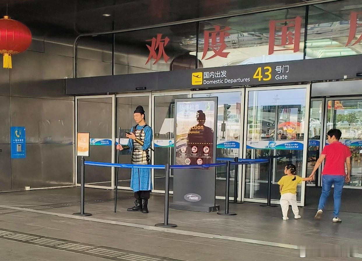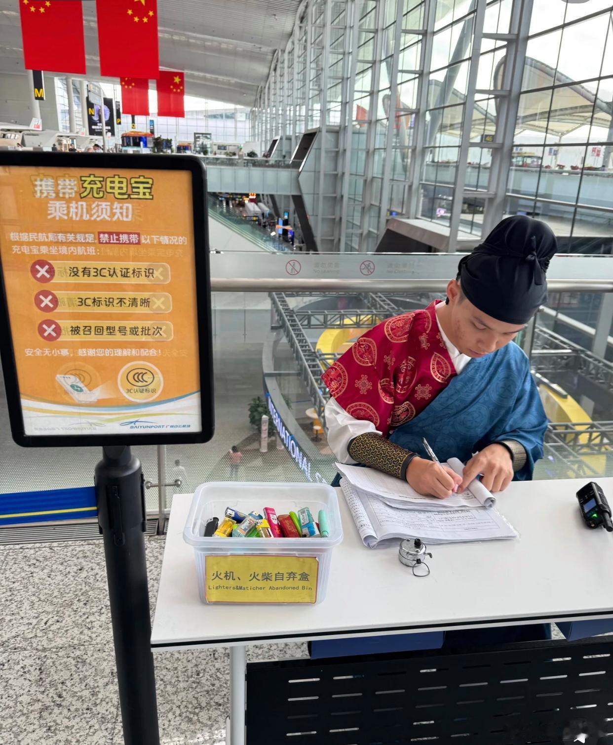 起猛了!在广州白云机场,我真以为自己穿越了!眼前全是穿着古装的工作人员——有戴着黑色帽子、穿着红蓝官服坐在桌前认真登记的小哥,桌上还摆着“充电宝须知”的牌子;有手持红缨枪、一身红黑戎装列队走过的“侍卫团”,背景却是“商务舱专用”的现代指示牌;还有穿着粉裙在自助值机设备前娴熟操作的小姐姐,专业手势配上这身打扮居然毫无违和感!
